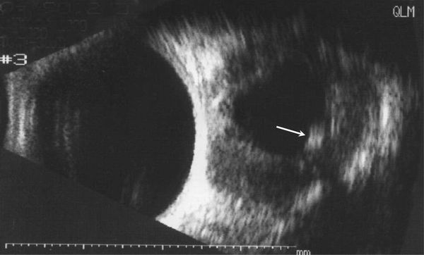 4.进一步检查 B超显示(如图):球后占位病变内有低回声,其内有强回声光点(囊虫,箭头)及筋膜囊水肿