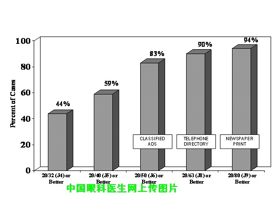 72%的病例达到 20/25 或更好                       88%的病例达到 (J8) 或更好 (报纸)