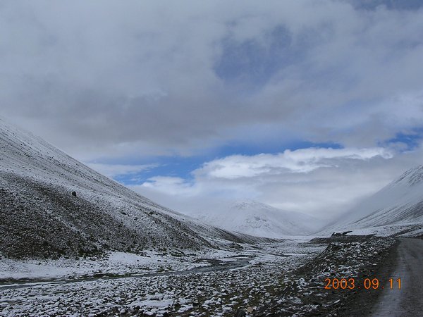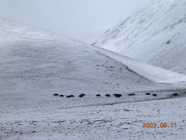 早晨8点上车从医院出发,在早点铺吃早饭后一不小心还把同行的在放射科工作的清华大学医学工程系的自愿者欧阳给丢了,还好很快发现,开车回去找到了他。与前次去纳木措不同,这次同车的多数是熟人因此一路上有说有笑,非常愉快。在车子翻山快到顶的时候,我们都被眼前的美景惊呆了。好一片美丽的雪域高原的景象,白雪覆盖了两旁的山峰,在阳光的照耀下显示出无比的圣洁和高贵,山腰缠绕的白云就象是带了洁白的哈达。我们不顾外面的寒冷,都非常兴奋的在外面欢呼起来。不停的拍照留念,希望把这美丽的雪域高原的风光永远的留在记忆中。我们几个年轻人还爬上了路旁的小山坡,看着这美丽的白色世界,心中充满了喜悦。难怪高原人民会崇敬白色的哈达,美丽的白色给人带来了崇高圣洁的意境。汽车一路前行,看到路旁还有孤独的高原人和牦牛群在顽强的前行,真是佩服这些生活在这里的人们对生活的热爱和与自然环境的完美统一。