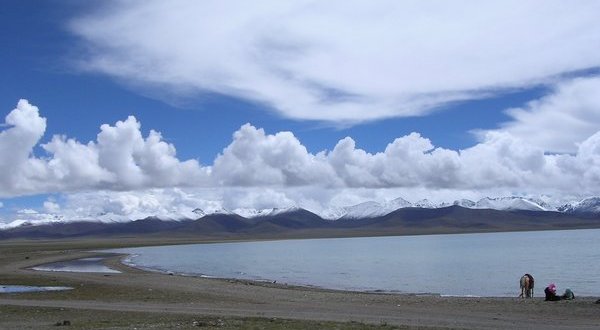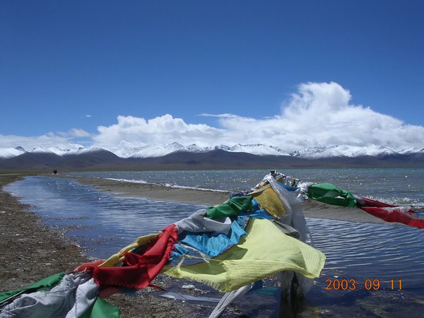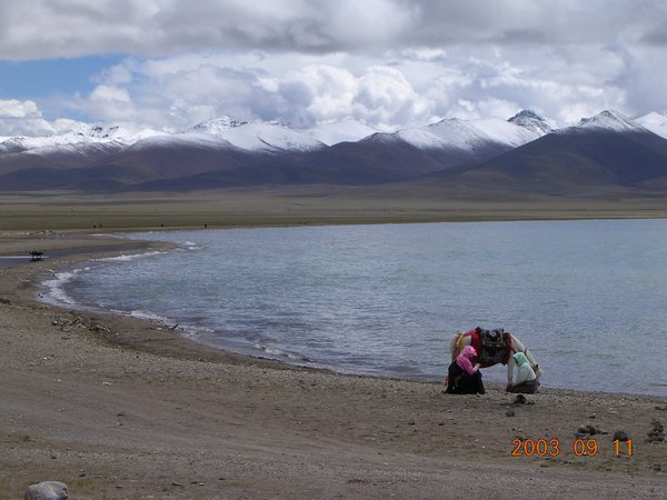 今天老天作美,翻过山下来就是清天,在蓝天的照映下,湖水呈现出海水般的深蓝色,于我们上次说看到的颜色大不相同,而且更加纯净美丽。同行的人们看到如此美丽的湖水不禁都欢呼起来,于是我们又停留在美丽的草原上远远地欣赏那一弯残月似的天湖。可惜的是天气冷了,上次我们曾经看到的牧民、帐篷和成群的牦牛、山羊都无影无踪。美丽宽阔的草原上只留下了我们这群远道而来的客人。等我们到了美丽的天湖边,发现水比上次少了,露出了湖边的沙滩。站在沙滩上,听着浪花拍岸的声音,望着湛蓝的湖水和远处水天一色的地平线,不禁疑心自己是站在美丽的海滨。很多藏民站在湖边邀请游人们骑坐他们的马或牦牛站站湖水中留影,我们也不能免俗,大家都高兴地骑坐在牦牛上踏入湖边的浅水区,体会在美丽的天湖水中遨游的快感。