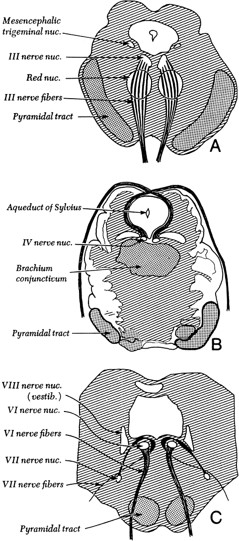 The organizational scheme of the oculomotor nucleus was proposed by Warwick.1 This hypothesis was substantiated by using retrograde degeneration techniques in monkeys. Substantiation of Warwick's hypothesis in humans relies on autopsy findings and neuroimaging results.2–4 Recent research in monkeys has suggested that the medial rectus muscle may not have only one subnucleus, as suggested by Warwick, but may receive innervation from three separate regions within the oculomotor nerve complex, which have been labeled A, B, and C.5 In addition to the extraocular muscle motor fibers, the Edinger-Westphal nuclei supply the parasympathetic preganglionic neurons that project to the ciliary ganglion. These nuclei are positioned dorsal and medial to the muscle motor nuclei. They are composed of two cell groups, a medial unpaired column and a lateral paired column. All evidence suggests that these fibers project ipsilaterally. There is a second source of parasympathetic fibers projecting to the ciliary ganglion in monkeys. Burde and Loewy6 have shown the source of these fibers to be Perlia's nucleus. This nucleus is found in the middle third of the oculomotor complex, positioned dorsally. The role of this structure in humans is unknown. FASCICLE The fascicular portion of the oculomotor nerve descends as its moves ventrally and laterally through the mesencephalon (Fig. 3A). The fascicles pass through the medial longitudinal fasciculus, the red nucleus, and the medial portion of the cerebral peduncle. During the passage through the ventral midbrain, there appears to be topographic organization of the fascicles so that a divisional paresis is possible even with intrinsic lesions.4 The oculomotor nerve exits the brain stem into the interpeduncular fossa as a horizontal arrangement of multiple fiber bundles that rapidly coalesce to form the subarachnoid portion of the third cranial nerve. NERVE After exiting the brain stem, the oculomotor nerve continues to course downward and laterally, reaching the top of the clivus at a point just lateral to the posterior clinoid process. During the passage through the subarachnoid space, the nerve passes just below the posterior cerebral artery and above the superior cerebellar artery (Fig. 4). After passing between these two arteries, the nerve travels adjacent to the posterior communicating artery. The close apposition of third nerve to these vascular structures accounts for the frequent involvement of this nerve by vascular anomalies, such as an aneurysm of the posterior communicating artery.