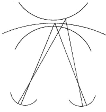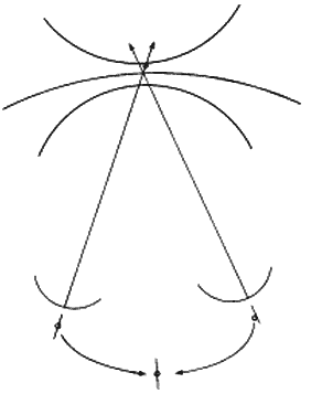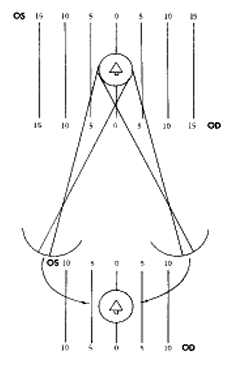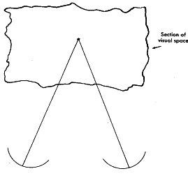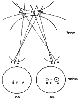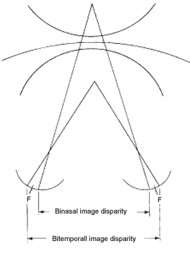 In sensory testing of a patient's binocular mechanism, color rivalry and color fusion (tints) form the basis of some tests. For example, a red lens before one eye and a green lens before the other causes the white viewed light to be perceived in color rivalry if the patient has single binocular vision; otherwise, either a red or a green sustained light is perceived. Another is the red glass test, in which a red glass is held before one eye while the patient views a white light. The patient with binocular vision sees a pink light (diluted from red), whereas the patient without fusion sees either a red or white light. ANGLE The angle of the light waves entering the eye has a significant response in binocular vision that is lacking in monocular vision. This is attributable to an object in space projecting onto retinal photoreceptors in each eye that have identical localizing values. A pair of such neuroepithelial elements is referred to as corresponding points. The foveas, as well as all other photoreceptors of the two eyes having identical directional values, are corresponding points. Images projected on these points are localized in space with the same values as though they were on only one of the corresponding points. Lines drawn from corresponding points through the nodal points of the eyes intersect in space either at a distance remote from the eyes or at a distance close to the eyes, depending on whether the eyes are fixating a distant point or are converged to fixate a near point. An imaginary plane including all the points of intersection of these lines in space is a horopter (Fig. 2). The horopter is an infinitely thin toric plane in space with its center being the fixation point. The concavity of the distant horopter is almost nil, but it increases with increasing nearness of the fixation point and consequent convergence. An object located at any point on this plane projects images onto corresponding points on the retina. The angle formed by the intersecting fixating axes equals all the other angles formed by lines drawn from all other corresponding retinal points that intersect at the horopter. Fusion All objects projecting onto corresponding points have their two images fused into one perception; however, the neurophysiology involved in binocular vision does not impose such a rigid requirement for fusion. Objects projecting onto slightly disparate retinal points also may be fused, provided that the disparate images are within a critical limit. The quantity of disparity between foveal images that permits fusion is small, but the permissible disparity of images, which allows fusion, increases progressively for the more peripheral retinal points. Therefore, for each retinal point in an eye, there is a definable corresponding area in the retina of the opposite eye within which the same image must project if the two images are to be fused into one (Fig. 3). The more eccentric the retinal point from the fovea, the larger the corresponding area is in the other eye. Lines drawn from the boundaries of the corresponding areas through the nodal point of the eye intersect in space, with each line extending from the corresponding point of the opposite eye. The line from the temporal boundary intersects the line of the corresponding point of the opposite eye proximal to the horopter (see Fig. 3). As in the construction of the horopter, if all points of the intersecting lines proximal to the horopter from retinal points and the temporal boundaries of the corresponding retinal areas of the opposite eye were connected by a plane, the proximal boundary of Panum's area would be defined. The distal border is defined by joining together all intersecting points distal to the horopter of lines from retinal points in an eye and the nasal boundaries of the corresponding retinal areas of the opposite eye. Since the peripheral retinal points have corresponding areas with larger dimensions than central retinal points, Panum's area is most narrow at its center and widens as it proceeds peripherally from the fixation area. The retinal area in one eye that corresponds to the fovea in the other eye permits inexact alignment of the visual axes. While the object of regard is imaged on the fovea of one eye, it is slightly displaced from the fovea in the other, yet single binocular vision occurs rather than diplopic binocular vision. The inexact fixation of one eye (Fig. 4) in the presence of single binocular vision is called fixation disparity.4 It is physiologic, and the maximal quantity of deviation of the fixation axes may range between 10 and 14 minutes of arc. If there is a convergent deviation (esodeviation) of the eyes, although fusion keeps the deviation latent to the degree that single binocular vision is possible (esophoria), there is an esofixation disparity. Divergent deviation (exodeviation) is accompanied by exofixation disparity. Simultaneous Perception All objects distal or proximal to Panum's area project their images outside corresponding retinal areas and are not fused. An object outside Panum's area projects its images on the retinas with a degree of disparity exceeding the boundary of the retinal area of one eye that directionally corresponds to the retinal point receiving the image in the other eye. Although these disparate images are not fused, if they are perceived simultaneously, the object is simultaneously localized by the eyes to different places in space (diplopia). All objects not located within Panum's area are diplopic unless the observer is inattentive to these objects. The diplopia due to simultaneously perceiving objects distal and proximal to Panum's area is physiologic, since this phenomenon is a component of normal single binocular vision. The physiologic diplopia is perceived as heteronymous for an object proximal to Panum's area, and homonymous for an object distal to Panum's area. If the object is in midline or laterally displaced short of a specific threshold from midline