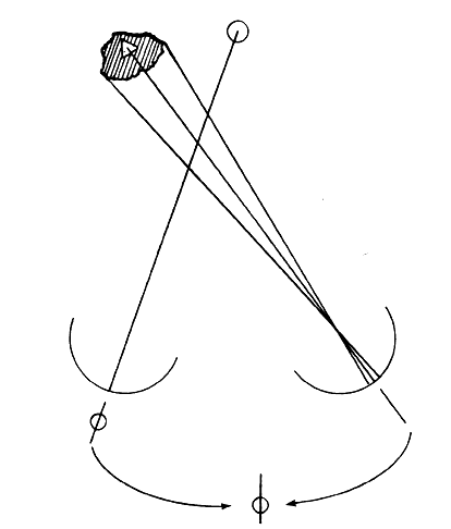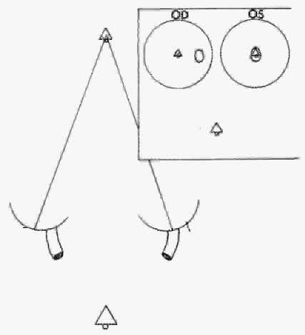 same place in space (visual confusion). DIPLOPIA Diplopia results from the simultaneous perception of the images of the object of regard projecting onto noncorresponding retinal areas of the strabismic eyes. The simultaneous perception of the two similar images under these circumstances yields the impression that the object of regard is simultaneously located at two points in space (Fig. 1). The size of the retinal area in one eye that corresponds to a retinal point in the other eye rapidly expands for retinal loci increasingly peripheral to the fovea. This determines the degree of retinal image disparity that either the macular or extramacular fusion reflex find tolerable. It accounts for Panum's visual space. Thereby, the depth of Panum's visual space is very limited for the macular fusion reflex to function within compared with the ever-expanding depth of fusional space within which the extramacular fusion reflex operates. This explains how an esotropic deviation may be sufficiently small to allow a spatial target peripheral to the object of regard (yet within Panum's fusional space) to project the peripheral target's images onto corresponding retinal areas while the object of regard projects its images onto noncorresponding macular areas (Fig. 2). According to Ogle,3 foveal horizontal image disparity greater than 20 minutes of arc (2/3 of a prism diopter) is not fusible. From my clinical investigation it appears that extramacular image disparity is fusible up to approximately 480 minutes of arc4,5 (8 prism diopters). The vast differences in tolerance of horizontal image disparity between macular and extramacular fusion suggest they are under the control of separate binocular vision reflexes. This reasoning is strengthened by the frequency of clinical cases that are devoid of a macular fusion reflex but have a normal extramacular fusion reflex. The purpose of the macular fusion reflex is to produce and maintain bifixation. If the reflex is absent or intermittently shut down for any reason, the patient monofixates. Monofixation is manifest by a three-degree facultative macular scotoma present only in the nonfixating eye during binocular viewing while the intact normal extramacular fusion reflex remains within 0 to 8 prism diopters of horizontal eye alignment. Such a large range of tolerance for horizontally disparate retinal images to be fused in the monofixator is easily demonstrated using stereopsis tests. Although the stereoacuity is poor in the monofixator compared with the bifixator,6 it does exist as long as the horizontal deviation of the eyes does not exceed 8 prism diopters. Along with the intact stereopsis, the fusional vergence amplitudes also remain normal in the monofixator as long as the horizontal deviation of the eyes does not exceed 8 prism diopters. In my experience, normal fusional vergence amplitudes and stereopsis perception occur only in normal retinal correspondence (NRC) but not in the adapted abnormal retinal correspondence (ARC). Stereopsis can occur only if the horizontally disparate images in the monofixator's peripheral vision are from targets within Panum's fusional space. Although the center of the Panum's area is scotomatized, the peripheral Panum's area exists in small angles of deviation. To maintain this small horizontal deviation of 0 to 8 diopters (D) requires a good functioning fusional vergence reflex that can be generated by NRC but not by ARC. VISUAL CONFUSION Visual confusion occurs in strabismus as a result of the projection onto corresponding retinal areas of simultaneously perceived dissimilar images of two different spatial objects that normally project onto noncorresponding retinal areas. Consequently, these different objects in space that create dissimilar images are perceived as located at the same place in space. Visual confusion does not exist for all portions of the visual field. The object of regard visually perceived by the fixating eye cannot simultaneously perceive a superimposed different image projecting on the fovea of the deviating eye. From the physiologic fact of binocular vision, as stated in Chapter 5, Fig. 13, only similar images projecting on the foveas are perceived simultaneously. No binocular function results from dissimilar images projecting onto these retinal areas. Consequently, from the moment the strabismic eyes deviate the patient is spared the visual confusion of a different spatial object's image conflicting with the object of regard. The three-degree macular scotoma in the esotropic left eye (Fig. 3) can be plotted using a binocular perimetric technique. This is a physiologic scotoma, present in all strabismic patients immediately at the moment the alignment of the eyes exceeds the threshold of 2/3 of a prism diopter. Therefore sustaining the bifixation reflex requires a very refined ocular alignment control along with an elegant level of similarity of the foveal images. The combination of these two inputs provide the essential stimuli for bifixation. The moment one or both are lacking, the bifixation reflex shuts down and a macular scotoma appears in the nonfixating eye. It is not a pathologic scotoma that evolves gradually to resolve the annoying visual symptom caused by strabismus. It is not an adaptation of the macular fusion reflex that gradually developed to eliminate visual confusion. In short, it is not a suppression scotoma. RETINAL IMAGE SIMILARITY VERSUS DISSIMILARITY In addition to image disparity, another stimulus that pertains to the alignment of the eyes with certain thresholds required for fusion is image dissimilarity. The threshold for image dissimilarity acceptable for fusion is different for macular fusion compared with extramacular fusion. Dissimilar image parameters are size, shape, clarity of focus, illumination brilliance, and color. Each has its threshold of dissimilarity that eliminates fusion. Anisometropia, media disturbances within the ocular tissues, optical appliances, and so fo