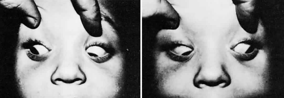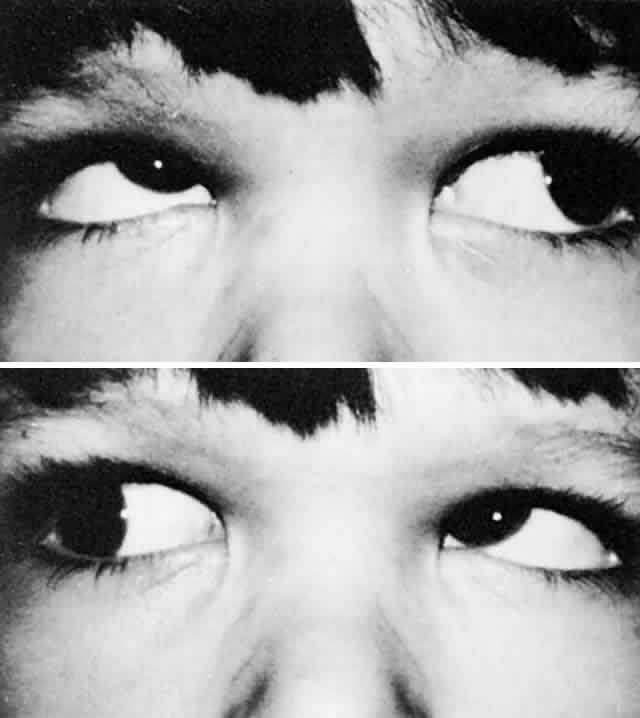 In contrast, the overacting inferior oblique muscle secondary to a palsy of the superior rectus muscle in the opposite eye or of the superior oblique muscle in the same eye is associated with a significant vertical deviation in the primary position plus a manifest excyclodeviation. Although the cyclodeviation is present in the primary position, it is maximal in abduction. Cyclodeviation may be measured subjectively by the double Maddox Rod test, Lancaster red-green test, haploscopic methods, and the Maddox Wing test. Anatomic measurements include indirect ophthalmoscopy, fundus photography, and blind-spot mapping.1 The vertical deviation in the primary position in secondary overaction of the inferior oblique muscle usually ranges between 10Δ and 25Δ and the excyclodeviation from 5° to 10°. Consequently, the patient with secondary overaction of the inferior oblique muscle has sufficient imbalance in both cyclodeviation and vertical elements with the contralateral superior rectus muscle or the ipsilateral superior oblique muscle to produce a positive Bielschowsky head tilt test.2 In contrast, the isolated vertical element involvement in primary overaction of the inferior oblique muscle is associated with a vertical deviation in the primary position of between 0Δ and 5Δ and zero excyclodeviation. Furthermore, on tilting the head toward the right or the left shoulder, neither the vertical alignment changes nor an excyclodeviation is produced. Histopathologic study of overactive inferior oblique muscles obtained at surgery did not demonstrate any abnormality on conventional hematoxylin-eosin staining.3 Histochemical and electron microscopic studies, however, revealed remarkable changes in the muscle fibers of the overactive inferior oblique muscle, demonstrating central cores, 100 μm to 150 μm long, in the orbital side of the muscle containing small-diameter muscle fibers that were highly positive in succinic dehydrogenase and lactic dehydrogenase activity. Aggregates of packed mitochondria were the constituents of these cores on electron microscopy, suggesting myopathic alteration of the inferior oblique muscles. Meyer and coworkers4 reported similar findings, with huge accumulations of mitochondria and muscle vacuolization related to the enlargement of the tubules of sarcoplasmic reticulum. These mitochondrial aggregates and vacuoles occupied more inferior oblique muscle surface in the primary overactive rather than secondary overactive inferior oblique muscles. In an electron microscopic study5 of overacting inferior oblique muscles—both primary and secondary—the most striking abnormalities were aggregations of mitochondria and degenerating mitochondrial profiles and increased vacuolization in primary and secondary overacting muscles. The muscle fibers were in different stages of atrophy, and hypertrophy and regeneration of muscle fibers were visible, suggesting that primary overacting inferior oblique muscles may be secondary to paresis of the superior oblique muscle. PRIMARY OVERACTION Primary overaction of the inferior oblique muscle apparently is not congenital. Rarely can the onset of this condition be recorded before 1 year of age. More commonly, onset is after 1 year of age; this condition may appear at any time during the first several years, most frequently between 2 and 4 years of age. Primary overaction of the inferior oblique muscle may be an isolated motility disorder or it may occur in conjunction with a horizontal deviation of the eyes. It seems to occur with equal frequency in patients with esotropia and in patients with exotropia. It appears with equal frequency in patients with congenital esotropia and in those with acquired esotropia. Furthermore, intermittency of the horizontal deviation does not seem to influence the frequency of this disorder. It occurs with about equal frequency in patients with intermittent exotropia and in those with constant exotropia. Wilson and Parks6 performed a statistical analysis of the onset and natural history of primary inferior oblique overaction in 456 strabismus patients. With 5 or more years of follow-up, 72% of patients with congenital esotropia, 34% of patients with accommodative esotropia, and 32% of patients with intermittent exotropia developed inferior oblique overaction at an average age of 3, 6, and 5.2 years, respectively. There was a positive correlation to the number of horizontal surgeries in congenital esotropia but not in the other groups. The incidence of overactive inferior oblique muscles was not related to the age at onset of strabismus, time from onset of strabismus to surgery, age at first surgery, or decompensation of ocular alignment. Primary overaction of the inferior oblique muscle may have its onset equally in the two eyes or it may occur only in one eye. After developing in one eye, it may gradually develop in the opposite eye. The dissimilarity in the degree of the overaction of the inferior oblique muscles may be temporary; with time, the degrees of overaction in the two muscles may gradually become equal. Unilateral overaction of the inferior oblique muscle occurs with sufficient frequency that the clinician is unable to make the statement that if one inferior oblique muscle overacts, eventually both will overact. In patients with unilateral overactive inferior oblique muscles, Raab and Costenbader7 found that the normal second inferior oblique muscle developed significant overaction in about a third of cases after unilateral inferior oblique weakening. In the presence of even the slightest overaction in the nonoperated inferior oblique, unilateral weakening of the overactive inferior oblique was followed in two thirds of cases by worsening of the nonoperated inferior oblique by 2 to 6 months postoperatively. Overaction of the second inferior oblique usually begins within 2 to 6 months of the onset of overaction of the first inferior oblique muscle, whether or not inferior oblique weakening sur