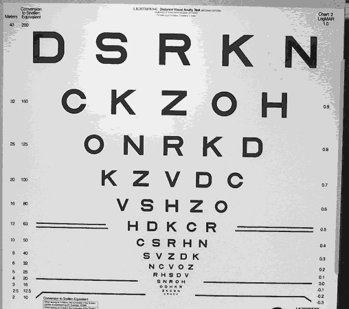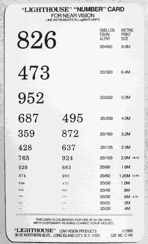 Many low vision acuity charts differ from regular charts in several ways. Each line of optotype is an equal factor smaller than the previous line and each line contains optotypes with similar resolution difficulty. There is also a proportional decrease in spacing that is equal to letter width in each particular line. Of course, the ability to resolve optotypes visually does not directly correlate with the ability to read text, and that is why it is important for patients to be tested on their preferred reading material. Some patients are not able to read letters because of unfamiliar language, illiteracy, or other types of cognitive impairment. For these patients, it is important to use number charts, symbol cards, or testing cards for the illiterate, which are available (Fig. 4). Even though some patients may be illiterate in reading letters, most can read numbers so that this is an important way of testing vision for near and far.