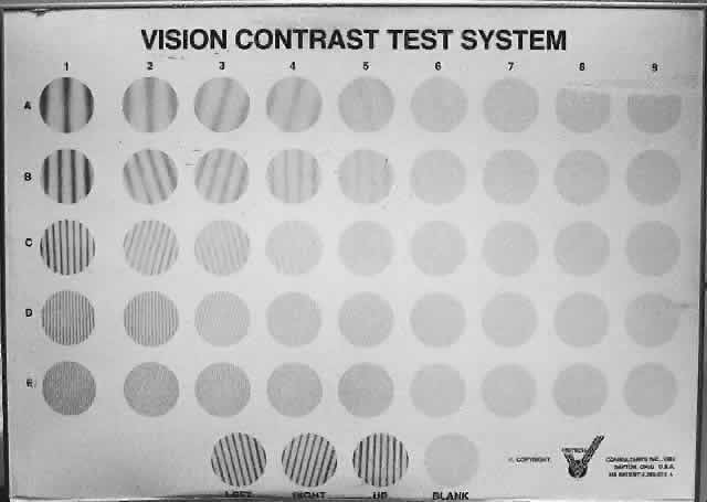 Another test that may be important to a visually impaired patient is the visual field.30,31 The clinician must know the location, density, size and the shape of central and peripheral visual field deficits to place reading material in an area where there is no visual field loss. Many patients with dense central scotomas, particularly those with macular degeneration, have difficulty with straight ahead vision and it is important to position the reading material to the right or left of fixation. Often the combination of performing a visual field test and vision rehabilitation examination on the same day may be too fatiguing for many elderly patients. Confrontation fields should be attempted because they are often very helpful. By knowing the area of the visual field loss, the low vision evaluator can best explain to the patient and family where to position materials to achieve the best possible vision. This also holds for distant vision but most patients quickly discover the head and eye position that provides maximum vision. This is very helpful for the patients who would like to walk around the neighborhood, watch television, and use their eyes for near, intermediate, and distance visual tasks. Besides confrontation testing, several others means exist to measure visual field tests from the tangent screen to the Goldmann perimeter to the automatic visual field machines. The scanning laser ophthalmoscope (SLO) can also be used to plot the scotomas present and also find the preferred retinal locus for the best vision.32 In any case, whichever modality is chosen, best approach should include a relatively shorter time visual field test that is much easier for elderly patients to use. Another possible visual measurement that may be important is that of color vision. Measuring color visual defects can be useful to many patients with loss of vision. For patients with severe vision loss, the Farnsworth D-15 color vision test can be used. This relatively inexpensive test can quickly be administered and can detect red, green, yellow, and blue perceptual defects. Many partially sighted patients complain of an increase in glare sensitivity. Quite often, normal sunglasses are too dark or not dark enough. This sensitivity occurs when light entering the eye is scattered, reflected, and diffused by surfaces in the media. Patients then complain of headache, fatigue, ocular discomfort, or a burning sensation in their eyes. Usually, these symptoms can be alleviated by adjusting the levels of surrounding illumination. Glare can occur with corneal scarring, cataracts, maculopathy, and neuropathy, as well as vitreous opacities. Several methods of testing glare sensitivity are used, such as a small penlight shone into an patient's eyes when he or she is trying to read or with the brightness acuity tester (BAT). With this device, visual acuity can be tested under low, medium, and high levels of glare. Besides controlling the direct source of illumination, glare can be reduced by using antireflective coatings on the front and back surfaces of spectacles or by adding an ultraviolet-400 coating. It is important to ask patients about their problems with lighting as well as to test it. Glare disability may indicate dry eyes and it is important to examine the patient for this condition. Glare disability may be improved with standard dry eye treatment. Contrast sensitivity testing may provide additional information, which can be used to measure a patient's ability to detect pattern stimuli at low-to-moderate contrast levels. A contrast sensitivity function test often gives a more complete designation of visual loss than visual acuity alone. The Vistech contrast sensitivity function screener, which can be used at 10 ft or modified to 3 ft, is available (Fig. 5).