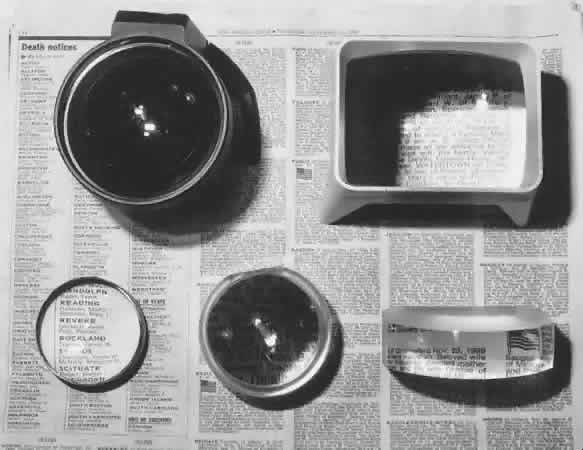 Driving with telescopic lenses has always been considered controversial.39 Many years ago the only way in which a person could pass a driver's test was to have spectacle- or contact lens-corrected 20/40 vision or better. Years before that, however, it was only 20/70. Most states in the United States have now modified their driving visual requirements in that 20/40 is the designated 24-hour driving vision and the 20/70 visual acuity needed to pass the driver's test for daylight driving only. Daylight driving is designated as 1 hour before sunrise and 1 hour after sunset. The reason telescopic lenses are considered controversial is because of the limited field, which reduces peripheral vision. Considerable training is necessary to achieve success with these generally expensive spectacles. Some practitioners who prescribe telescopic lenses for driving often prescribe the telescope to be placed at the top of the lens of one spectacle and recommend using it for spotting purposes only. Some patients use telescopic spectacles for watching television at a distance even though these lenses limit the depth of focus and the peripheral visual field. Having patients sit close to the television screen affords a wider field and the magnification of nearness. Telescopes can also be used for near and intermediate tasks. One can focus telescopes for near viewing by adding plus lenses behind the ocular, by adding plus lenses in front of the objective lens, or finally by increasing the tube length of the telescope. The greatest advantage of using a near focused telescope for a close visual task is the increased working distance afforded the user. The working distance with a near telescope is increased over a simple microscopic magnifying spectacle by a factor of the power of the telescope. For example, a 3× telemicroscopic system focuses at 10 in whereas a similar 3× microscopic spectacle focuses at 3.3 in. The disadvantages of this telescopic system, however, are reduced depth of focus and a smaller field of vision. Several reasons suggest that the telemicroscopic or near focused telescopic systems are useful in tasks that prohibit close working distance and require the hands to be free (e.g., viewing computer monitors, reading music to play musical instruments, crafts, mechanical work, typing, drafting). These near focused telescopic systems are available as spectacle borne, spectacle mounted, handheld, or mounted on a tripod. There are also slip on, clip-on monocular telescopes that can be placed over spectacles for intermittent use such as in classroom lectures and then can be removed from the spectacle and slipped back into a pocket to carry easily. There are also some investigative intraocular implants being developed, which have a highly minus concave lens in the center of a convex intraocular lens implant. During routine activity, these patients may benefit from the normal power of the intraocular lens but when a strong convex spectacle is placed before their eyes another type of Galilean telescopic system is created. These implants may be used in the future for patients with macular degeneration who have difficulty with distance vision. These patients can presumably use this system while seated and looking out into the distance. These implants may also produce double vision. It is still open to question whether these intraocular lens implant telescopes are of help to those visually impaired. CONTACT LENSES Contact lenses are another optic device for use in vision rehabilitation. They are particularly useful in situations when irregular corneal refractive surfaces produce blurry vision such as in keratoconus and in some highly myopic states. Contact lens in these situation provide an enlarged, less distorted retinal image. Before the days of intraocular lens implantations, contact lenses were of enormous help to aphakic patients. Very few patients are left aphakic these days and those who are can wear contact lenses or have the secondary placement of intraocular lenses. There are also patients with no pupils in aniridia who would benefit from contact lenses with an opaque iris painted on it. In a patient with binocular potential, it is helpful if a patient can us both eyes together in reading. This is possible in vision rehabilitation to a maximum binocular spectacle reading addition of + 4.00 to + 6.00 D. Many patients who are visually disabled may require this strong reading addition. However, with greater strength lenses, the focal length must be shorter. The greater the reading addition the closer the patient must hold the print to his or her eyes. Again, the clinician must stress to the patient that it is not harmful to hold reading material as close to the eyes as necessary. The simplest type of spectacles for reading are single vision lenses. Many patients are accustomed to bifocals, and of course, these can be prescribed for close work. High plus reading bifocals or reading spectacles make it difficult to achieve binocular visual acuity unless significant prism or decentration is incorporated into the lenses to compensate for the amount of convergence required to read at close distances. A very helpful rule of thumb is the one that was devised by Gerald Fonda according to which he recommended decentering in each reading segment by 1 mm for each diopter of reading addition for each eye.40 If, for example, a + 5.00 D reading addition is recommended, each individual lens should be decentered in 5 mm. Most patients with severe low vision problems usually do not have binocular vision, but using binocular vision is attainable, it is definitely of benefit to these patients. In general, a + 6.00 D reading addition is the maximum that can be used to achieve binocular vision.41 Many different types of reading glasses exist; one of the most popular is half-eye glasses that are usually preferred because they are lighter lenses and patients can look over the top for distance vision. Testing sets of rea