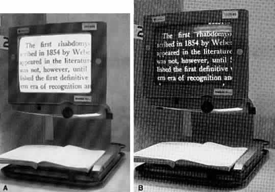 Another type of stand magnifier is the Visolette (see Fig. 9). This model has a constant magnification of approximately 1.8× to 2.2× and concentrates the light diffusely on the object with a minimal peripheral distortion. This is an advantage if the patient's head blocks some of the ambient light. This magnifier can be used with a spectacle magnifier and is useful for patients with tremors or poor hand coordination because it rests on the page. ELECTRONIC MAGNIFIERS Closed circuit television (CCTV) magnifiers often provide excellent contrast and magnification; they can also furnish color and reverse contrast polarity (Fig. 10). Many patients can read with these devices. The print is projected white on a black background, advantageous because the projected black page reduces glare. These devices can provide linear magnification electronically up to 60× . This device can be modified for various uses in reading, writing, typing, crafts, computers, blackboards, and other sedentary distance viewing activities. An evaluation with a CCTV magnifier is important for patients who have high reading demands or severe visual field loss or those who require 6× or more magnification for near. The limitations of the use of CCTVs are that they may be expensive, heavy, scarcely portable, and may be difficult for some people to use. Many public and university libraries have these electronic devices. Some newer devices connect to television sets and can be used for near and far. Other headborne devices electronically magnify for distance and for near. These may be suitable for some patients but others find it difficult to wear them for extended period of time. PATHOLOGY AND VISION REHABILITATION Pathology of the eye or brain can cause several categories of visual defects.42 First, there can be an overall general field defect with diffuse, blurry, hazy vision; second, a central visual field defect, and third, a peripheral field defect. Some patients may have a combination of all or some of these visual problems. Patients with central blurry vision often have central distortion and a scotoma in the central fields, which can originate at or near the macular region. Those with peripheral field problems have loss of portions of the peripheral field with constriction of field. Age-related maculopathy, cataract, glaucoma, and diabetic retinopathy are the main causes of loss of vision in developed countries.43–47 This has also been true in studies performed in the past in the Vision Rehabilitation Center of the Massachusetts Eye and Ear Infirmary.48 Adult cataracts as well as cataracts in children are an increasingly creating general central and peripheral visual problems: it is estimated that more than 50 million people are affected worldwide.49 These people have symptoms of blurred vision, poor contrast, glare, photophobia, faulty color perception, and often have difficulty reading and driving because of their cataracts. Ophthalmologic and biomicroscopic examination identifies the type of cataract so that diagnosis is often easy. The possible risk factors for cataract formation include diet, antioxidants, alcohol intake, sun exposure, diabetes mellitus, galactosemia, and severe diarrhea.50 It is important in all patients with cataracts that the retina should also be carefully examined to rule out any macular disease. Cataract extraction can benefit these patients even though macular pathology may be present. There should be a realistic discussion with the patient as to the potential for visual improvement. Cataract surgery is one of the commonest surgical procedures performed in the United States.51 Many patients with immature cataracts are served best by having a very careful refraction and given the best possible spectacle correction. Cataract surgery, as with any surgery, has both risks and benefits and although the benefits far outweigh the risks, a change of glasses is often the best first approach to the patient with immature cataracts that do not interfere significantly with visual function. These days with modern cataract surgery and with the implantation of intraocular lenses, restoration of vision is usually quickly and safely accomplished. Macular disease, particularly age-related macular degeneration, is one of the leading causes of visual impairment in our society. Affected patients may have atrophy, fibrovascular scarring, pigment clumping, hemorrhage, or localized cystic changes in the macula and perimacular regions. There are great variations in the development of this maculopathy; many patients with advanced degenerative signs often may have good vision yet other patients who do not appear to have very much retinal damage may have severe visual impairment. It is important in evaluating these patients that all modalities of investigation be performed to provide the best care. All such patients should have potential acuity evaluations to ascertain their best possible vision. Other testing procedures that may provide valuable information include visual field testing and scanning laser ophthalmoscopy. These patients have central scotomas so that it is important to document the depth and position of the scotoma to use the peripheral intact retinal areas in the visual rehabilitation process. Glaucoma is a dominant cause of visual loss. Generally, patients with this condition have a peripheral visual field loss that may ultimately lead to central field loss. It has been estimated that glaucoma is the second leading cause of bilateral blindness in the world.52 It is also a disease that goes undetected in its early stages. For these reasons, suspect patients must have accurate visual field studies made to determine where visual field losses and scotomas exist. Many glaucoma patients also have cataracts. Some may benefit from removal of the cataract and implantation of an intraocular lens accompanied by a glaucoma filtration procedure. In the past, the only eyedrops that were available for glaucoma w