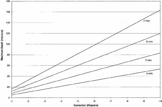 ![]() and where BVP is the back vertex power of the cornea in diopters, Pa is the power of the anterior surface in diopters, Ppis the power of the posterior surface in diopters, ra is the radius of anterior curvature in meters, rp is the radius of posterior curvature in meters, and t is the thickness of the cornea in meters. In this equation, n1 is the refractive index of air (1.000), n2 is the refractive index of the cornea (1.376), and n3 is the refractive index of aqueous humor (1.336). In a hypothetical epikeratophakia patient with a preoperative radius of anterior curvature of 7.7 mm and a desired correction of +15.00 D, Equation 3 predicts that the desired postoperative radius of anterior curvature would be 5.9 mm. However, with this new anterior curvature and increased corneal thickness, the back vertex power of the cornea would increase by 16.6 D instead of by the desired 15.0 D. It is evident that for the relatively high refractive changes achieved with lamellar refractive keratoplasty, alterations in corneal thickness should be taken into account. Barraquer, in his keratomileusis calculations, used an estimated effect of the change in corneal thickness: the final radius of anterior curvature calculated by Equation 3 is reduced by 0.004095 mm for each diopter of myopic correction. Finally, as the position of the anterior surface of the eye is moved, the effective axial length of the eye is also altered. This effect is taken into account if back vertex power of the cornea is used. Determining Amount of Tissue Removal The following formula can be used to calculate how much of the axial corneal stroma must be removed to achieve the desired myopic correction: