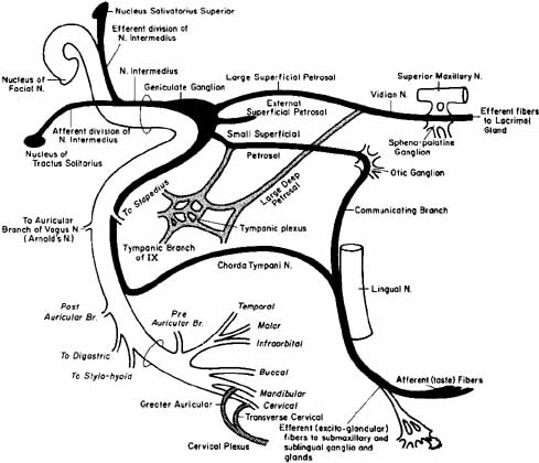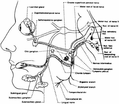 PONS The facial motor nucleus contains about 7,000 motor nuclei 8 and is located in the ventrolateral angle of the lower pontine tegmentum (see Fig. 1). The facial nucleus can be divided into four separate cell groups that supply specific muscle groups: (1) dorsomedial (auricular and occipital muscles), (2) intermediate (frontalis, corrugator, and orbicularis oculi muscles), (3) ventromedial (platysma), and (4) lateral (buccinator and buccolabial).9 The motor axons exit the nucleus dorsally, loop around the abducens (VI) nucleus, and form the facial genu before emerging from the lateral aspect of the pons. The superior salivatory nucleus, which is located just rostral to the facial motor nucleus, is the origin of the parasympathetic fibers that supply the sublingual, submandibular, and lacrimal glands. These salivary and lacrimal fibers join the facial nerve as the nervus intermedius in the cerebellopontine angle. Because the facial nucleus is located ventromedial to the cochlear nuclei and the spinal tract and nucleus of the trigeminal nerve, a lesion of the lateral pons may result in ipsilateral facial paresis, ipsilateral facial analgesia, ipsilateral Horner's syndrome, and ipsilateral deafness (Foville's syndrome). If the lesion extends further dorsally, an ipsilateral gaze paresis would result from involvement of the sixth nerve nucleus. The combination of a unilateral sixth nerve palsy, an ipsilateral seventh nerve palsy, and a contralateral hemiparesis is known as the Millard–Gubler syndrome. Intrinsic lesions of the brain stem are usually the result of infarction, hemorrhage, tumor, or demyelination. CEREBELLOPONTINE ANGLE The facial nerve, the nervus intermedius, and the eighth (vestibuloacoustic) cranial nerve exit together from the ventrolateral aspect of the pons, surrounded by a leptomeningeal covering. In the lateral pontine cistern, the anteroinferior cerebellar artery may loop between the seventh and eighth cranial nerves as the artery courses posteriorly to supply the dorsolateral pons and cerebellum.10 As the nervus intermedius approaches the internal auditory meatus, it joins the facial nerve. Because of the association of the facial nerve with the nervus intermedius and the vestibuloacoustic nerves at the level of the cerebellopontine angle and in the internal auditory canal, tearing, taste, submandibular saliva flow, hearing, and balance are disturbed with mass lesions at this level (Fig. 5). From the brain stem to the internal auditory canal, the facial nerve is covered only by a thin layer of glia, which makes it quite vulnerable to any type of surgical manipulation but quite resistant to a slow process of stretching or compression, as might occur with an acoustic schwannoma. Large tumors that fill the cerebellopontine angle compress neighboring cranial nerves and cause defects of the 5th and, later, the 9th, 10th, and 11th cranial nerves. Lesions that occur in this area include temporal bone fractures, acoustic neuromas (schwannomas), meningiomas, and primary cholesteatomas. Hyperkinetic disorders are attributed to vascular compression of the root of the facial nerve. TEMPORAL BONE The motor portion of the facial nerve and the nervus intermedius are loosely joined together as they enter the internal auditory meatus with the acoustic nerve. In this region, the facial nerve and nervus intermedius course superiorly to the vestibuloacoustic nerve. As the facial nerve emerges from the internal auditory meatus, it departs from the vestibuloacoustic nerve to enter the fallopian (facial) canal. The course of the facial nerve through the fallopian (facial) canal is unique; no other nerve traverses so long a distance through a canal (28 to 30 mm). The nerve follows a remarkable Z-shaped course in its intratemporal portion (Fig. 6).11 Furthermore, it incorporates a sensory ganglion, the geniculate. In the fallopian canal, the nerve trunk can be divided into labyrinthine, tympanic, and mastoid segments. The labyrinthine segment includes the geniculate ganglion, and it is at this level that the first branch of the facial nerve arises, the greater superficial petrosal nerve. This nerve traverses the dura of the floor of the middle cranial fossa, synapsing in the sphenopalatine ganglion; postganglionic secretory nerve fibers travel with the zygomaticotemporal nerve of the fifth nerve (V-2) and eventually join the lacrimal nerve of V-1 to innervate the lacrimal gland. Involvement of the greater superficial nerve in the middle fossa (e.g., from neoplastic invasion, inflammatory processes, and trauma) impairs reflex tear secretion. When defective tearing accompanies abducens or trigeminal nerve palsy, a lesion in the middle cranial fossa is indicated. Although lacrimal fibers are classically carried by the nervus intermedius, parasympathetic neurons variably reach their destination by way of branches of the fifth or ninth cranial nerves, because there are ample opportunities for intermingling among these nerves (Fig. 7). At the geniculate ganglion, the facial nerve makes a sharply angled turn posteriorly, forming a knee (genu) to enter the tympanic, or horizontal, portion of the fallopian canal. The distal tympanic segment emerges from the middle ear between the posterior wall of the auditory canal and the horizontal semicircular canal, just beneath the short process of the incus. At this point, the fallopian aqueduct makes another turn downward, forming the second genu. This marks the beginning of the mastoid segment. The nerve continues vertically downward on the anterior wall of the mastoid process to the stylomastoid foramen. The chorda tympani is the terminal branch of the nervus intermedius and usually arises from the distal third of the mastoid segment of the facial nerve. The chorda tympani nerve contains secretory motor fibers to the submaxillary and sublingual salivary glands. It also carries special sensory afferents from the anterior two-thirds of the tongue (taste) a