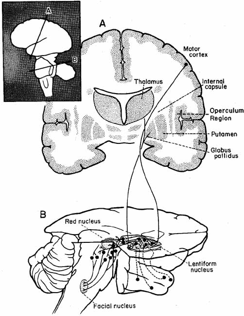 Because preservation of forehead function is insufficient evidence of a cortical lesion, other neurologic signs should be sought. A cortical lesion that produces a contralateral lower facial palsy is usually associated with a motor deficit of the tongue and with weakness of the thumb, fingers, and hand on the same side as the hemifacial weakness, with lesser involvement of the leg. The cortical motor areas of the face, tongue, thumb, fingers, hand, and upper extremities lie near each other in the precentral territory nourished by the rolandic branch of the middle cerebral artery. Patients with such cortical lesions are unable to voluntarily smile, but facial expression is appropriate in response to an amusing story. Similar clinical findings may occur with lesions that involve the descending corticobulbar and corticospinal tracts.7 Although facial muscle tone is not significantly impaired with a supranuclear lesion, slight flattening of the nasolabial fold and drooping in the corner of the mouth may be detected contralateral to the cortical lesion. EXTRAPYRAMIDAL SYSTEM The extrapyramidal system (Fig. 4) consists of the basal ganglia and the descending motor projections other than the fibers of the corticospinal (pyramidal) tract. Anatomically, this system appears to be a diffuse, multisynaptic network that interconnects extensively with centrencephalic and brain stem structures. These pathways are not as well clarified as those of the primary (pyramidal) motor tracts. The extrapyramidal system is concerned with automatic and emotional facial language. The dull, expressionless face of parkinsonism is a well-known result of extrapyramidal pathway disease, whereas the spontaneous facial dystonia of Meige's syndrome is characterized by unilateral or, more often, bilateral blepharospasm associated with dystonic movements of the mouth and other lower facial muscles. Progression of this latter disorder may lead to chaotic contractions of the tongue and cervical muscles.