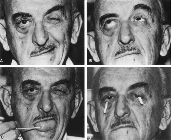 MOTOR EVALUATION Assessment of facial nerve motor function begins by observing the patient at rest and noting any asymmetries of the face or of blink pattern. Most supranuclear and infranuclear facial nerve palsies are associated with a flattened nasolabial fold and a slightly widened palpebral fissure on the paretic side. Facial movement in response to emotional stimuli and voluntary command should also be assessed. A dissociation in response of spontaneous and voluntary movements is suggestive of supranuclear defects. Disease of the corticobulbar tracts tends to spare emotional facial responses, whereas disease of the basal ganglia preserves voluntary movements. Preservation of forehead wrinkling, seen best in attempted upward gaze, is also characteristic of supranuclear lesions (Fig. 9). Forced eyelid closure should be performed, and asymmetries in eyelash burying or lagophthalmos (i.e., partial or total inability to close the lids) should be noted. TASTE Taste receptors are distributed over the tongue and pharynx. Axons with cell bodies in the geniculate ganglion receive stimuli from receptors and project postganglionic afferents back to the nucleus tractus solitarius in the medulla. The seventh nerve carries taste fibers from the anterior two-thirds of the tongue; taste from the posterior third of the tongue is supplied by the ninth nerve. Taste is best tested with a cotton swab dipped in a sour, sweet, or bitter solution (see Fig. 9). Unilateral ageusia (loss of taste) may be useful in identifying a facial lesion as peripheral, but it should be noted that bedside tests of taste are crude and often unreliable. TEAR FUNCTION Evaluation of tear function by observation alone, without actual testing, may lead to erroneous impressions (e.g., that a patient with a facial palsy is tearing excessively). Testing for tearing is of limited diagnostic and prognostic value, unless tear production is drastically reduced or absent on the involved side. In addition, the results of actual tear testing may be similarly misleading. Increased tear flow (epiphora) noted by history can be due to exposure irritation, paralytic ectropion, or failure of the lacrimal pump apparatus of the lower lid; it is not likely to be related to an irritative lesion of the greater superficial petrosal nerve. Similarly, decreased tearing, rather than suggesting a destructive process involving, for example, the greater superficial petrosal nerve, may be due to corneal hypesthesia. Tear testing usually involves Schirmer paper strips placed in the inferior conjunctival cul-de-sacs. To avoid erroneous results from pooled tears, the conjunctival tear lake is dried before insertion of the paper strips (see Fig. 9). A Schirmer strip is inserted into the conjunctival sac of the uninvolved eye, and moments later a strip is placed in the involved eye. By following this sequence, the reflex blepharospasm and tearing provoked by stimulating the normal eye do not influence results in the contralateral eye. About 10% of patients with Bell's palsy have decreased or absent corneal sensation, usually from exposure hypesthesia or as a form of adaptation.16 In such cases, a topical anesthetic is instilled into both eyes before the Schirmer strips are placed, to eliminate the problem of selectively stimulating the eye with normal corneal sensation. The length of moistened paper is compared on the two sides after a period of 5 minutes. In the event that one of the filter strips becomes completely moistened before 5 minutes, both strips are removed and compared for results. Less than 5 mm of wetting is highly suggestive of a tear deficiency, but this finding should be viewed in the context of the patient's clinical history and the results of the slit lamp examination. BLINK REFLEX Stimulation of either cornea with a cotton wisp or tissue corner will cause a bilateral blink. The ophthalmic division of the fifth nerve (V-1) is the afferent limb of the blink reflex, with first-order neurons synapsing primarily in the chief sensory nucleus within the pontine tegmentum. Second-order neurons project from the chief sensory nucleus to both facial nerve nuclei. Thus, if the left ophthalmic division is defective, neither eye will blink to left corneal stimulation. If the right cornea is stimulated in this setting, both eyes will blink. This scenario must be contrasted with the case of a left facial nerve palsy in which only the right eye will blink fully, regardless of which cornea is stimulated. The neural control of eyelid function, and especially of the blink reflex, is the subject of an extensive monograph by Schmidtke and Buttner-Ennever,17 and electromyographic studies of eyelid movements are reviewed by Evinger and colleagues.18 PHYSIOLOGIC FACIAL SYNKINESIS Classically, Bell's phenomenon results in the upward and outward deviation of each eye during lid closure against resistance. This palpebral–oculogyric reflex is particularly obvious in patients with lower motor neuron facial paresis and lagophthalmos (i.e., incomplete eye closure). Although the precise neural pathway is unknown, connections between the seventh- and third-nerve nuclei are implicated by this phenomenon. Francis and Loughhead19 have found a wide variability in the character of Bell's phenomenon in normal subjects. In their series, many patients showed responses that did not conform to the typical “up and out” eye movement pattern. In addition, on repeated testing, subjects showed variable responses. Clinically, Bell's phenomenon is most useful in distinguishing infranuclear and supranuclear ocular palsies. Typically, upward deviation of the eyes with forced eyelid closure is preserved in supranuclear lesions. In some normal persons, the external ear retracts and flattens against the mastoid with conjugate lateral gaze. This is known as the oculogyric auricular reflex and is usually greater in the ear opposite the direction of lateral gaze. The presumed neural mechanism in