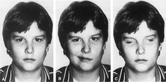 The differential diagnosis and treatment of facial paralysis in the newborn have been reviewed by May and associates114 and Harris and co-workers.115 The two main differential diagnostic possibilities are developmental and traumatic (Table 6). Traumatic neonatal facial palsies are usually unilateral and may result from pressure on the infant's mastoid area from the maternal sacral prominence.116 Although Hepner117 found the incidence of facial paralysis to be the same for natural and forceps deliveries, more recent studies implicate obstetric forceps as a risk factor for neonatal facial palsy. Among 44,292 babies delivered over a 5-year period, 92 were found to have facial palsy.118 Eighty-one of these palsies were believed to be related to birth trauma, most notably forceps use. The remaining 11 instances were developmental. Nearly 90% of the facial palsies related to birth trauma had complete spontaneous recovery by 1 year.118