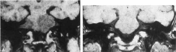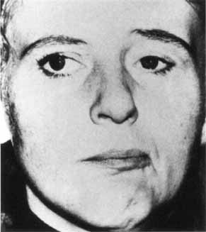 The most common finding associated with developmental facial paralysis is the presence of one or more other congenital anomalies. Weakness of the lower lip has particular significance in that it may be associated with multiple congenital anomalies. In one study of asymmetric facies, noted especially during crying, associated congenital anomalies were found in the skeletal, genitourinary, respiratory, and cardiovascular systems119 Developmental bilateral facial palsy is often incomplete, with the lower portion of the face usually less affected than the upper part. This distinguishes it from facial palsy due to trauma, which is rarely bilateral and shows equal involvement of the lower and upper face. Bilateral immobility of the face may not be apparent at birth and may be manifested by incomplete eyelid closure when asleep, by a gaping mouth, and by an inability to suck. Möbius' syndrome is a rare congenital disorder that usually includes bilateral hypoplasia of facial muscles, unilateral or bilateral horizontal gaze palsy, anomalies of the extremities, absence of chest muscles, and involvement of other cranial nerves, especially the hypoglossal. Neuroimaging may demonstrate brainstem hypoplasia and calcification. Many pathologic findings have been described in Möbius' syndrome, including nuclear aplasia and neuronal degeneration (Fig. 21) (see elsewhere in these volumes).120 There is no effective way to restore facial function in the newborn or young child with a facial paralysis due to a congenital anomaly. Management should be directed toward preventing complications and performing reanimation procedures as the patient approaches the teens. Children with facial paralysis from birth usu-ally do not have problems with keratitis and corneal scarring unless there is a poor Bell's phenomenon, decreased tearing, or entropion with irritation of the globe from eyelashes rubbing against the cornea. The child should undergo slit lamp evaluation periodically, and if there is any evidence of frank keratitis, medical and perhaps surgical measures should be considered to correct the deformities. |