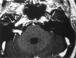 nerve palsy is rarely associated with a benign parotid tumor.87 ACOUSTIC NEUROMA Most acoustic neuromas arise from the vestibular division of the eighth nerve within the internal auditory canal. When the tumor is confined to this canal, hearing loss is the main sign; few patients have obvious involvement of the facial nerve. As the tumor expands and extends to the cerebellopontine angle, facial weakness may occur from stretching of the facial nerve. Other findings include nystagmus, decreased corneal reflex, and facial hypesthesia. In a series of 53 acoustic neuromas, only five patients had facial weakness at presentation.88 When a patient presents with bilateral acoustic neuromas, the diagnosis of neurofibromatosis should be considered. On CT scan, acoustic neuromas may be seen as enhancing masses in the internal auditory canal or cerebellopontine angle. For smaller tumors, gadolinium-enhanced MRI may be very helpful. On T1-weighted gadolinium images, neuromas may appear as uniformly enhancing masses, effacing the brain stem and cerebellum with extension into the internal auditory meatus or canal. On T2-weighted images these lesions appear hyperintense (Fig. 15).89 Treatment usually consists of microsurgical excision with the use of techniques that may provide complete removal of tumor and preservation of the facial nerve. Intraoperative facial nerve monitoring during acoustic neuroma surgery may improve the preservation of facial nerve function.90,91 Spontaneous recovery of facial function usually begins by 3 to 4 months after surgery and is typically finished by 1 year. Those palsies persisting beyond one year are likely to be permanent.92