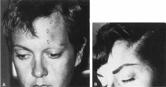 PROGRESSIVE HEMIFACIAL ATROPHY (PARRY-ROMBERG SYNDROME) Hemifacial atrophy is an unusual condition of unknown etiology. It is characterized by spontaneous and slowly progressive atrophy of the skin and subcutaneous tissue on one side of the face and scalp (Fig. 19). There is a slight female predominance, and the disorder typically begins within the first two decades of life. Involvement of the soft tissues surrounding the orbit and in the orbit is common, such that progressive unilateral enophthalmos occurs107 Other findings include focal alopecia, loss of lashes and eyebrow hairs, linear scarring of the scalp (en coupe de sabre), exophthalmos, poliosis, ptosis, miosis, mydriasis, iris heterochromia, uveitis, motility disturbances, corneal opacities, refractive error, and optic nerve atrophy. The presence of subtle fundus abnormalities, including choroidal atrophy, retinal telangiectasis, and retinal pigment epithelium changes, has been documented.108 Besides migraine headache, the most common neurologic complication is seizures, which may be generalized or focal in nature.109 Other reported neurologic associations include hemiparesis, hemianesthesia, hemianopia, and aphasia. Chung and colleagues110 reported a case of epilepsy with frontal lobe leptomeningeal sclerosis subjacent to forehead scleroderma. There is no treatment for this disorder, and reconstructive surgery is best delayed until progression ceases. |