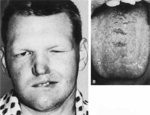 myotonic dystrophy. Recurrent facial paralysis has been noted to occur in an idiopathic form, the Melkersson-Rosenthal syndrome, and even with tumors.111 The recurrence rate in our experience with idiopathic palsy was 12%. In contrast to recurrent facial paralysis on the same side, contralateral recurrence is almost always due to idiopathic palsy; alternating facial paralysis has been noted only rarely with other disorders. Melkersson-Rosenthal syndrome (Fig. 20) is the most common example of a rare disorder that features recurrent alternating facial palsy; recurrent edema of the lips, face, and eyelids; cheilitis; and fissured tongue. Most authors agree that the presence of any two of these four manifestations permits the diagnosis.112 It has been suggested that facial swelling is the most consistent finding in Melkersson-Rosenthal syndrome.113 Perhaps the diagnosis of this syndrome should be reserved for only those patients with the finding of facial edema, because there is recurrence in 12% of Bell's palsy patients, and a fissured tongue can be seen in otherwise normal persons. The etiology of Melkersson-Rosenthal syndrome is unknown, although biopsy findings of buccal mucosa have shown noncaseating granulomas. Associated ophthalmic findings have included retrobulbar neuritis, lagophthalmos, corneal opacities, and keratoconjunctivitis sicca. Treatment has largely been unsuccessful and has included trials of antibiotics, antihistamines, irradiation, steroids,113 and more recently, thalidomide.