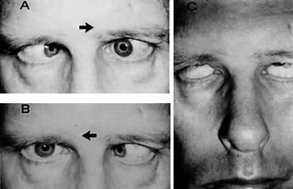 Fig. 6. Bilateral sixth and seventh nerve palsies due to basal skull fracture. A. Left gaze. B. Right gaze. C. Attempted lid closure demonstrates intact Bell's phenomenon and lagophthalmos.