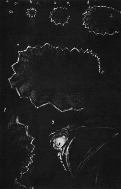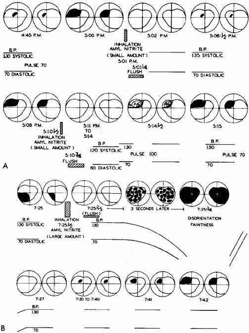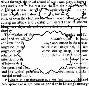 One important aspect of the visual disturbance just described, is that it expands slowly, over a period of 10 to 20 minutes. The initial region of visual abnormality is most often near fixation and then, as described by Lashley,49 with increase in size the disturbed area moves or “drifts” across the visual field so that its central margin withdraws from the macular region as its peripheral margin invades the temporal; the area may be totally blind (negative scotoma), amblyopic or outlined by scintillations. The scintillations surrounding the negative scotoma make “fortification” figures or spectrums, so called by the appearance of a “map of the bastions of a fortified town.”49 The scintillations are brilliant, with the intensity of a bright fluorescent bulb flickering at a rate of 5 to 10 cycles per second (Figs. 4 and 5). Gowers,68 commenting on the descriptions by the British astronomer, Sir George Airy, and his physician son, Dr. Hubert Airy (both migraineurs), was particularly impressed with the intensity of the visual sensation. Many migraine sufferers can precisely recall their own vivid visual experiences well enough to describe them precisely or even on occasion to paint them (Fig. 6 and 7). Not all migraine visual disturbances begin near the fixation point; some patients consistently experience scotomas starting eccentrically in the visual field, and these sensations can appear alternately or simultaneously in both hemifields (Fig. 8). Other less dramatic visual auras also occur: just the sensation of peripheral brightness or awareness of a rhythmicity or pulsating character in the intensity of the ambient light. The duration of these visual symptoms is measured in minutes rather than the brief few seconds of flashing, bright moving spots, or transient flickering phenomena characteristic of occipital epileptic discharges.7,68 Additional visual disturbances are categorized by Klee and Willanger,66 consisting of metamorphopsia, diplopia, polyopia, and apparent movement of stationary objects. Variations in the scotomas of migraine, including their occurrence in patients with acquired blindness, are well described.65,69 The auras of migraine, although most commonly only visual, have many other associated manifestations, such as hemihypesthesias, perioral anesthesia, vertigo, and transient aphasia. The aura or prodromes of classic migraine may be precipitated by intense stimuli: bright lights, loud noises, head trauma, or the intake of certain foods in susceptible individuals. In the usual sequence of migraine with aura the sensory prodrome precedes the onset of the headache (in accord with the traditional concept of vasoconstriction followed by vasodilatation). The visual disturbance rarely may have a simultaneous onset with headache or, once having disappeared, may recur following the onset of headache. Such unusual patterns, or strict unilaterality for all attacks, should increase suspicion of a mass lesion or vascular malformation. As opposed to definite periodicity with symptom-free intervals and predictable circumstances, as in migraine without aura, migraine with aura may occur “out of the blue” and in multiple attacks over a few days. Migraine-with-aura attacks tend to diminish in the third and fourth decades. While most migraine patients experience a stereotyped clinical pattern, there is a well-recognized group in which both classic and common migraine attacks are admixed.70 Some patients with classic migraine may lose the headache component eventually and suffer only isolated auras thereafter. This monosymptomatic pattern stresses the importance of accurate history-taking when confronted by a patient with isolated visual phenomena (migraine dissociée). Haas71 emphasized the occurrence of “migraine aura status”. The differential diagnosis should include consideration of vertebro-basilar transient ischemic attacks. Symptomatology that favors migraine has been reviewed by Fisher,72 and includes luminous visual images, build-up of images, progression from one aura to another, and benign outcome. |