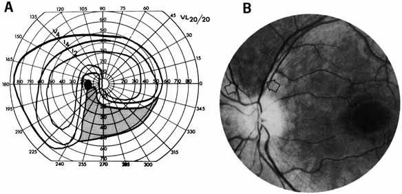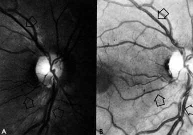 Retinal migraine occurs more frequently than ophthalmoplegic ‘migraine.’ We estimate the frequency of strictly monocular visual phenomena occurring in conjunction with migraine to be 1 in 200 migraine sufferers. Frequently, however, homonymous visual field phenomena in migraineurs is incorrectly attributed to a single eye. For example, a patient with transient right homonymous hemianopia might think that the right eye is affected, because normally the right temporal hemifield is 30 to 40 degrees larger than the left nasal hemifield.122 The exact genetic predisposition to this subtype of migraine headache is unknown. The familial occurrence is similar to that expected in all patients with migraine preceded by visual aura, with an estimated 25% positive familial history. Retinal migraine is expected to be more common in women than men, which is true of migraine headaches in general, but this also has not been documented. One may consider two forms of anterior visual pathway migraine: transient monocular blindness and permanent unilateral visual loss, a much less common occurrence. The transient form has a relatively stereotyped presentation, consistent with retinal or optic nerve hypoperfusion from spasm of the central retinal or ophthalmic artery. For example, 10 of 24 patients reported by Tomsak and Jergens123 described concentric contraction of vision, and only 5 of their patients had an altitudinal or quadratic visual change consistent with spasm of retinal artery branch. Kline and Kelley124 studied a patient with a history of cluster headache and documented a reduction in central retinal artery blood flow during an attack of ocular migraine by intravenous fluorescein angiography. They noted no change in choroidal perfusion, also suggesting selective spasm of the central retinal artery. Others have noted retinal artery constriction during episodes of migrainous transient monocular blindness125,126 or normal arterial caliber.127 It is of interest to note that in the case reported by Wolter and Burchfield,127 a review of the fundus photographs depicts venous vasoconstriction as well as retinal opacification during an episode (Fig. 11). Recently Burger and co-workers128 reported amaurosis fugax episodes caused by documented vascular constriction in the retina. Their patients did not have retinal migraine, but showed the ability of retinal vascular constriction to produce monocular episodes of amaurosis in the absence of embolic phenomena. Permanent unilateral visual loss from anterior visual path migraine is well documented but uncommon. In addition to arterial or venous retinal vascular occlusions,95,126,129,130 central serous retinopathy, vitreous hemorrhage, retinal hemorrhage, and ischemic optic neuropathy have been noted.131,132 Newman et al.133 reported bilateral central retinal artery occlusions, disk drusen, and migraine, and other descriptions of anterior visual path migraine and vascular retinopathy are reported.134,135 A recent unconfirmed report suggests that up to one-third of migraineurs have retinal or optic nerve type visual field defects when tested with automated perimetry.136 A typical history is that of a young adult with a pattern of common or classic migraine, who has recurrent episodes of monocular visual loss or monocular scintillating scatomas. The visual loss is often one-sided, stereotyped in nature, and tends to affect the entire monocular visual field,123 although any of the visual patterns described in migraine with aura may occur on a monocular basis in “retinal” migraine. Carrol137 suggested that such transient episodes never have a preceding fortification spectra, that the absence of accompanying headache was invariable, and that the visual disturbance never lasted more than 10 minutes. Permanent visual loss is the exception rather than the rule. Transient anterior visual pathway migraine is not associated with other neurologic symptoms but may be precipitated by postural change or exercise. Approximately one-third of patients have a prior history of migraine.123 Ocular migraine as a cause of transient monocular blindness should be a diagnosis of exclusion. This was highlighted by a recent case138 in which a young medical student had episodes of amaurosis fugax, occasionally accompanied by headache, and was considered to have retinal migraine. In actuality he was found to have a large pituitary tumor. Walsh and Hoyt67 state that “the eye itself can be involved in the angiospastic circulatory disturbance of a migraine attack,” and that subsequent visual disturbance is caused by retinal hypoxia. The retinal arterioles have been reported to be constricted during such an episode by some authors67,125 or to be normal despite an ischemic retina.127 Ischemic papillopathy in migraine was presented by McDonald and Sanders,139 with sudden monocular visual loss in a migraine patient who had experienced multiple bouts of transient amaurosis of the same eye. A typical nerve fiber bundle defect was present on visual field testing, and fluorescein angiography showed areas of delayed choroidal filling in the peripapillary region. Typical case histories of “retinal migraine” are presented here.