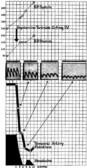 More potent narcotic analgesics such as propoxyphene, meperidine, morphine, hydromophone, and oxycodone are available alone and in combination. However, because of medication overuse and rebound, these agents should be used sparingly and only for patients who experience infrequent headaches.14 Further discussion about the use of opioids and transnasal opioids are discussed by Silberstein and Lipton.9 Headaches similar to migraine can be triggered by serotonergic drugs such as reserpine and m-chloralphenalpiprazine (serotonergic agonist).37,38 Two agents effective in the acute treatment of migraine, sumatriptan,247–249 a serotonin analogue, and dihydroergotamine (DHE),250,251 an ergot derivative. These agents block the development of neurogenically induced inflammation in rat dura mater. This in turn blocks the release of neuropeptides including substance P and calcitonin gene-related peptide, preventing neurogenic inflammation.9 The NSAIDs may also block neurogenic inflammation; the mechanism of this action, however, is less certain. Ergotamine and DHE can be used to treat moderate to severe migraine.252 It was once the mainstay of acute therapy. It was once said that “if a headache does not respond to ergotamine tartrate, it is not true migraine.”253 This agent, derived from Claviceps purpurea, a fungus that grows in rye and other grains, is the major compound effective as a specific agent in an acute migraine attack. Ergotamine is one of the naturally occurring alkaloids in crude ergot; all the ergot alkaloids are derivatives of lysergic acid.254 Ergotamine has as one of its major pharmacologic properties the ability to produce a peripheral vasoconstriction and, in higher doses, damages capillary endothelium. Inasmuch as ergotamine is neither sedative nor analgesic and other forms of pain are not relieved by the drug, its action is believed to directly related to the pathophysiology of migraine. In the classic experiments of Graham and Wolff,255 the intensity of pain was directly related to the amplitude of the temporal artery pulsation, and both decline in response to intravenous ergotamine tartrate (Fig. 13). DHE is available in 1 mg/mL ampules, which can be administered intramuscularly, subcutaneuously, or intravenously.14 DHE nasal spray with 40% bioavailability is also available. Dosage for individual attacks should be limited to 1 mg intramuscularly or intravenously, with a maximum of 3 mg/d. Monthly limits, according to Silberstein and Lipton, are 18 ampules or 12 events. The oral combination for ergotamine tartrate with caffeine (Cafergot: 1 mg ergotamine tartrate and 100 mg of caffeine) remains widely used. The oral absorption of ergotamine is erratic. While often effective, it shares the disadvantage of most of the oral ergotamine preparations in that it can produce nausea and vomiting itself. However, patients who cannot tolerate ergotamine because of nausea can be pretreated with metoclopramide 256 Proclorperazine, promethazine257 or a mixture of a barbiturate and a belladonna alkaloid for patients with intractable migraine intravenous DHE has been recommended.258 It should be noted that pregnant women should not use ergot preparations because of their potent oxytocic effects. Fortunately, pregnancy usually brings a diminution in the symptoms of migraine. Ergot preparations in high doses may cause peripheral capillary endothelial damage, peripheral paresthesias, pain, and even gangrene. These preparations are generally not recommended for patients in septic states or who have coronary artery disease, obliterative peripheral vascular disease, or cardiac conditions. As indicated by Goadsby,16 the main advantage of the ergotamines is low cost and long experience with use; however, their pharmacology is complex and they have generalized vasoconstrictor effects that may be associated with vascular vents, high risk of overuse syndrome, and rebound headaches.259 Is it advisable to use vasoconstricting agents during a complicated migraine prodrome, such as mild hemiparesis or dysphasia? If the cerebral event is indeed vasoconstriction, will ergot preparations potentiate the possibility of permanent cerebral infarction? Theoretically, the preparations act only peripherally and not on the intracranial vasculature. However, since little is really known of the actual central nervous system effects of the ergot alkaloids,254 it may be wise to be cautious with their use if prominent central nervous system symptoms precede the headache attack. THE TRIPTANS The triptans have now been available for over 10 years, the initial agent being sumatriptan. There are now six other triptans with varying forms including oral dosing, subcutaneous injection, nasal spray, and rapid oral disintegrating tablets (Table 15). As noted by Goadsby,16 compared to the ergot medications, the triptans have significant advantages— notably, very selective pharmacology, simple and consistent pharmacokinetics, and established efficacy based on well-designed controlled trials and a well-established safety record.260,261 The triptans are serotonin 5-HT1b/1D-receptor agonists. It is believed this agonist activity is the primary mechanism of the therapeutic effect of the drugs which have three potential mechanisms of action: cranial vasoconstriction, peripheral neuronal inhibition, and inhibition of transmission through second-order neurons in the trigeminocervical complex.16,262 Specific contraindications to the use of the triptans include ischemic heart disease, sustained hypertension, Prinzmetal's angina, and hemiplegic and basilar-type migraine. Side effects of the triptans include: tingling, parasthesias, and sensations of warmth in the head, neck, chest, and limbs. There are less frequent side effects such as dizziness, flushing, and neck pain or stiffness. It should be noted that triptans can constrict coronary arteries and can cause chest symptoms which may mimic angina. There has been extensive use of the