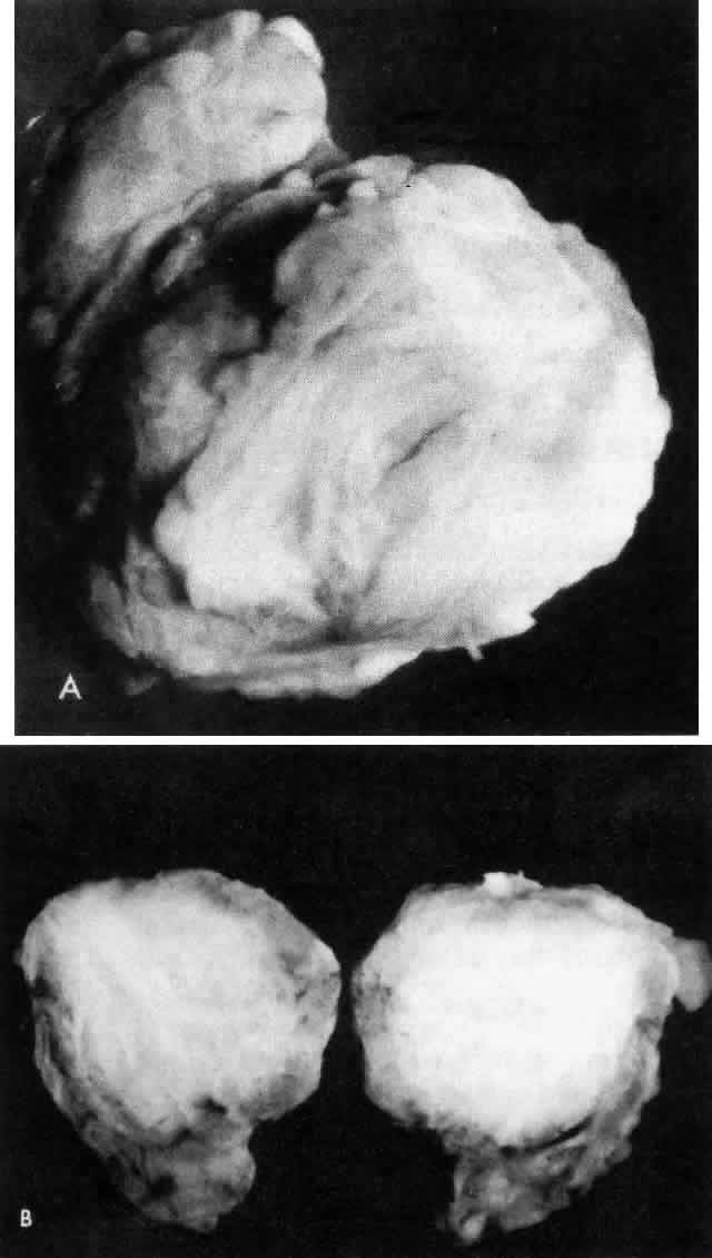 MULTIFOCAL FIBROSCLEROSIS Idiopathic fibrosis involving a variety of body structures can occur in association with a low-grade orbital inflammation.354–357 Systemic symptoms depend on the body structures that are involved in the fibrosclerosing process. Retroperitoneal and mediastinal fibrosis, sclerosing cholangitis, and fibrosclerosis of the thyroid gland (Riedel's struma) are all associated with this disease process.354,358 Fibrosclerosis of the thyroid gland differs from Hashimoto's thyroiditis in that the former is associated with complete destruction of all elements of the thyroid gland, replacing it with chronic inflammatory cells and a dense fibrosclerotic infiltrate that can extend to involve the muscular structures in the neck, while the latter is associated with maintenance of the lobular architecture of the thyroid gland despite the presence of an inflammatory response with no extension of the disease process beyond the capsule of the gland. Retroperitoneal fibrosis may be associated with ureteral obstruction and uremia.359 Obstructive jaundice occurs in association with sclerosing cholangitis.358 Orbital involvement may be unilateral or bilateral.354,355,359 There is proptosis due to the deposition of dense hyalinized collagen and scattered fibroblasts. This is a paucicellular lesion without evidence of lymphoid follicles or lipid-laden histiocytes. The management of this condition includes corticosteroids and radiation. However, the extensive fibrosclerotic changes are relatively unresponsive to these therapeutic modalities. Surgery may be indicated to correct obstructions of the ureter and biliary system. |