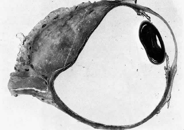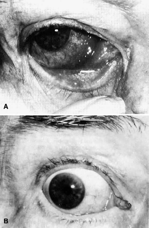 WEGENER'S GRANULOMATOSIS Wegener's granulomatosis is characterized by inflammatory lesions of the upper respiratory tract, lower respiratory tract, the kidneys, and, to varying degrees, generalized small vasculitis of other structures, including the eye (Figs. 10 AND 11). The definitive diagnosis is confirmed by biopsy. A limited form of the disease has been described that spares the kidneys. Ocular manifestations include orbital inflammation, scleritis, keratitis, and uveitis. The ocular involvement can occur from extension of sinus and nasal lesions or from focal small vessel vasculitis. Epidemiology Wegener's granulomatosis is an uncommon disease but is increasingly recognized in recent literature. In a 1957 review of the literature, Straatsma identified 29 cases.144 Between 1957 and 1977 an additional 342 cases were revealed.41 Additional series have been reported subsequently.42,145–147 Eye involvement occurs in 30% to 50% of cases.41,42,144,148 Ocular manifestations may be the presenting or sole manifestation in some patients.41,42,145,149 Orbital involvement with proptosis is the most commonly recognized eye finding in patients with the generalized form of the disease.41,148 It is uncertain whether the ocular findings or prognosis differs between the limited and generalized forms of the disease over long-term follow-up. The disease is slightly more common in males than females.42,147 The most common age at presentation is in the fourth and fifth decades,148 although Wegener's granulomatosis has been described in children146,150 and the elderly.146,151 Systemic Manifestations Upper respiratory tract signs and symptoms are a common early manifestation of Wegener's granulomatosis and include nasal obstruction, serosanguineous discharge from the nose, lesions of the mucosa, sinusitis, and serous otitis media. As the disease progresses, nasal septal perforations and saddle-nose deformity occur. Focal involvement of small vessels can affect the middle ear, cochlea, larynx, trachea, and throat.42,152 Oral ulcers, gingivitis, and alveolar bone involvement may occur, but perforation of soft or hard palate should raise the suspicion of other causes of midline granuloma.148 Complaints of weakness, malaise, weight loss, or arthralgias often accompany the respiratory involvement. The maxillary sinus is the most commonly involved sinus,42,152 and thickening of the maxillary antrum is reported to be one of the earliest radiologic signs. Symptoms of lung involvement include cough, dyspnea, chest pain, and hemoptysis.42,148 Lung involvement may be symptomatic in one third to one half of patients, but further evaluation demonstrates involvement in almost all patients.42,147,148 Classic radiologic findings are multiple bilateral nodular infiltrates, which tend to cavitate,147 but findings may vary from poorly defined infiltrates to solitary lesions.42,152 Hilar adenopathy and pulmonary calcifications are rare.147 Renal involvement is a late event and is frequently the cause of death in patients who are not successfully treated.42,152 The limited form of the disease is distinguished by the absence of renal involvement.146,153 Because of the lack of renal involvement, the limited form of the disease has a lower mortality rate. Nervous system involvement includes peripheral and cranial neuropathy. The fifth and seventh cranial nerves are the most frequently affected,42,147 and this involvement can be bilateral.42 Involvement of the middle ear may account in part for the involvement of the seventh cranial nerve.42 Involvement of the meninges and brain may occur as a result of focal vasculitis and contiguous spread from the upper respiratory tract. Generalized small vessel vasculitis may have manifestations on a variety of organ systems. In 40 to 50% of patients, skin lesions will eventually develop.147 These may be ecchymotic, ulcerative, or in the form of subcutaneous nodules.42 Ulcerative lesions are the most common and may become chronic.42,148 Subcutaneous nodules are rare.152 Histology shows necrotizing vasculitis with thrombosis.154 Pericarditis, myocarditis, and coronary arteritis may occur. These findings may be subclinical, which may explain the absence of cardiac findings in some series.42,147 As many as two thirds of patients will complain about arthralgias or demonstrate arthritis.147 The arthritis is nondestructive. The joint symptoms often wax and wane with the course of the disease at other sites. Ocular Manifestations Ocular involvement of Wegener's granulomatosis occurs as a result of contiguous spread from the upper respiratory tract and from focal small vessel vasculitis involving ocular structures. Proptosis, orbital pain, limitation of extraocular movement, and periocular edema suggest orbital involvement. The orbital presentation may be identical to that of idiopathic orbital pseudotumor except that bilateral presentation is more frequent in Wegener's granulomatosis and other vasculitides.3 Orbital involvement may be the initial or presenting manifestation of the disease or may follow known upper respiratory tract and sinus involvement. In severe cases optic nerve compression, optic disc edema, retinal vascular congestion, and exposure keratopathy may occur. The optic nerve may also be directly involved by the vasculitic process. Orbital cellulitis may occur in association with sinusitis.42 The orbital inflammation may be rapidly progressive, requiring surgical decompression in addition to systemic therapy.42 However, the surgical intervention has also been associated with flare of the disease and healing difficulties because of active vasculitis. As a general rule, surgery should be avoided until the inflammatory process is brought under control by aggressive medical treatment. Unlike orbital involvement, nasal and lacrimal duct destruction are a late manifestation of Wegener's granulomatosis.155 The manifestations include epiphora and recurrent dacryocystitis. The obstruction i