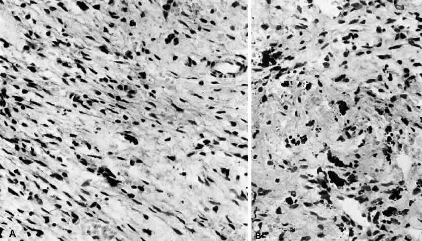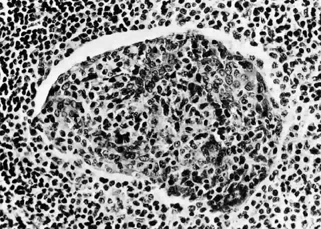 NODULAR FASCIITIS Nodular or pseudosarcomatous fasciitis, while not usually considered part of the spectrum of idiopathic orbital inflammation, represents a localized inflammatory disease of idiopathic origin. It appears to be a reactive process involving a proliferation of immature connective tissue elements along with acute and chronic inflammatory foci (Fig. 7).102–106 This entity has been reported periorbitally in the eyelid as well as in the epibulbar tissue. It may also occur in the anterior or deep orbit. It appears as a rapidly growing mass arising over several weeks or months. It may or may not be associated with pain. At surgery, the lesion appears fairly well demarcated and slightly reddish. Histopathology Microscopically there is a proliferation of immature and active-appearing fibroblasts within the orbital fascial planes.102–106 These fibroblasts may be loosely connected with occasional myxoid foci interposed. Slits often appear between the fibroblasts, which appear to be quite plump and have basophilic cytoplasm. There may be rare mitoses among these cells. Only a minimal amount of collagen deposition is present. The appearance of a gradient from immature fibroblastic elements to more mature fibroblasts is characteristic of this lesion. Also associated with this process is acute and chronic inflammatory cells, capillary and endothelial cell proliferation, and occasional giant cells. Occasionally elements of this inflammatory process can be seen to invade surrounding muscle fibers and orbital fat. The proliferating capillaries are friable and bleed. When this occurs, hemosiderin-laden macrophages can be identified in the tissue. Electron microscopic evaluation of the cells present in this process shows that most are myofibroblasts. These are cells containing rough endoplasmic reticulum and no basement membrane like fibroblasts but also cytoplasmic actin filaments with fusiform densities like smooth muscle cells.3 Treatment Although this process often appears to be malignant, especially with its rapid growth and the immature appearance of the fibroblasts that are present, it is a benign inflammatory condition. Fibrosarcoma does not usually have an significant inflammatory component, nor does it demonstrate both immature and mature tissue elements. Rhabdomyosarcoma is a consideration when this lesion is present in a child. Myositis is also a possible member of the differential diagnosis, although this entity is more confined to the muscle tissue than the fascial planes. The treatment of nodular fasciitis is local surgical excision, which usually proves to be curative. BENIGN LYMPHOEPITHELIAL LESION Lacrimal gland enlargement in the absence of systemic disease without dry eye symptomatology has been termed benign lymphoepithelial lesion.3,107 Previously this entity was known as Mikulicz's syndrome or disease. However, due to confusion as to the exact definition of these terms, they have been abandoned. Histologically this condition is characterized by sheets of lymphocytes and plasma cells that replace the normal acinar and ductular structure of the gland (Fig. 8). Lymphoid follicles may be present. The remaining ductular elements may proliferate to form solid nests of cells outlined by excessive basement membrane production. Hyalinization may sometimes occur within these ductular remains. The cells within these nests are for the most part epithelial elements of the ducts. These structures are commonly called myoepithelial islands because of the incorrect belief that normal ducts have myoepithelial cells present in their wall. This has been disproved on electron microscopic evaluation.108 On superficial examination these formations may resemble lymphoid follicles. The presence of these ductular nests helps to differentiate this disorder from lymphomatous involvement of the gland, which is not associated with these structures. From one third to one half of patients with Sjögren's syndrome may have similar nests of ductular elements. The difference between benign lymphoepithelial lesion and idiopathic orbital inflammation (inflammatory “pseudotumor”) involving the lacrimal gland is based on the more monomorphic infiltrate seen in benign lymphoepithelial lesion in contrast to the relatively more polymorphic infiltrate seen in “pseudotumor.” In addition, “pseudotumor” contains more plasma cells and fibrotic tissue and is associated with lymphoid follicles with active germinal centers. Finally, the lacrimal gland capsule is usually preserved in benign lymphoepithelial lesion in contrast to inflammatory “pseudotumor,” which is a more destructive process. |