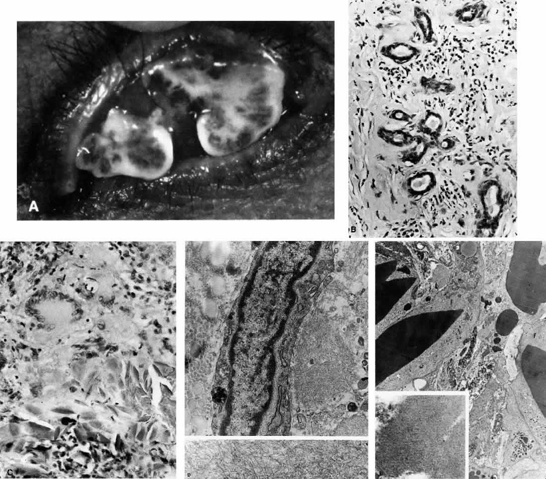 AMYLOIDOSIS Amyloidosis is a disease process characterized by the deposition of amorphous hyaline material in various body tissues, including nerves, blood vessels, muscles, skin, spleen, adrenal glands, liver, heart, tongue, and orbit (Fig. 9).109 Two types of primary amyloidosis have been identified. One is a localized process restricted to the ocular and orbital structures without systemic manifestations.3,110–115 The second is characterized by ocular as well as systemic deposition of amyloid.3,116 This may also occur in a familial form with amyloid infiltrating the heart, peripheral nerves, and blood vessels.3 Retinal deposits occur owing to extension of the amyloid from the retinal vasculature, and infiltration of the trabecular meshwork can result in glaucoma. Secondary amyloidosis occurs as part of a variety of chronic disease entities, including tuberculosis, rheumatoid arthritis, leprosy, osteomyelitis, multiple myeloma and other plasma cell dyscrasias, and, occasionally, lymphoma.3 A systemic evaluation for these conditions should be performed in any patient presenting with amyloidosis. Symptomatology and clinical findings associated with this disease process depend on the tissues that are invaded by the amyloid. Most lesions hemorrhage quite easily owing to vascular infiltration. Patients can present with periorbital or subconjunctival hemorrhage. Loss of extraocular motility and ptosis from muscle involvement, vitreous opacities and retinal deposits secondary to intraocular infiltration, and pupillary abnormalities from deposits in the cervical lymph nodes can occur.110,117–119 Ocular involvement in secondary amyloidosis is unusual. However, the presence of waxy yellow skin nodules that bleed with only slight trauma is characteristic of systemic amyloidosis. Congestive heart failure, gastrointestinal motility disturbances and malabsorption, hepatosplenomegaly, and proteinuria and the nephrotic syndrome occur with systemic involvement of the associated organ systems. Localized amyloid deposits in ocular disease can occur in any portion of the orbit and globe. Systemic disease is not usually associated with conjunctival, lacrimal gland, or orbital amyloid deposition.110,112,118,120 This is in contrast to skin deposition, which is usually associated with systemic amyloid. Pseudoptosis may be present owing to a mass effect, although deposition in Müller's muscle and the levator aponeurosis is also a cause of ptosis.113,117 Deposits palpated through the eyelid feel somewhat cystic in contrast to the more superficial infiltrates, which appear as friable excrescences or nodules protruding from the conjunctiva. Lacrimal gland enlargement and proptosis can also occur as a result of localized amyloid deposition.110 Orbital and extraocular amyloid is not associated with pain. Vision is only rarely affected, usually from optic nerve infiltration.121 Double vision may occur when there is amyloid deposition within the extraocular muscles.119,122 Histopathology Amyloid deposits appear as paucicellular hyalinized amorphous material. A surrounding granulomatous response similar to that of a foreign body is present in reaction to this material.3,123 Scattered elongated fibroblasts and plasma cells are also present throughout the infiltrating material. Perivascular infiltration is characteristic of this process. Amyloid deposits are eosinophilic on routine hematoxylin and eosin staining, appearing similar to extensive collagen deposition. These deposits also stain positively with periodic acid-Schiff, Congo red, crystal violet (which shows metachromasia), and thioflavin T. The material is birefringent and dichroic when viewed by polarization microscopy. When amyloid is examined by electron microscopy, nonbranching thin fibrils with a distinct periodicity are seen.109 Antibodies against immunoglobulin fragments may react with localized amyloid deposits. Monoclonal staining of lymphocytes and plasma cells seen in association with amyloid deposits may occur.124 A wide variety of proteins are present in amyloid deposits. These proteins differ between individuals presenting with this disorder and between different forms of the disease. It appears that a circulating protein is converted when phagocytized into fibrils that, when coalesced, form amyloid deposits.123,125 Protein AL is present in patients with multiple myeloma and in primary systemic amyloidosis.123 This protein consists of complete Κ or λ chains with or without N-terminal fragments from these light chains. Bence Jones protein from patients with multiple myeloma may be modified to form protein AL. Protein AA is part of amyloid deposits associated with inflammation.126 This protein may be a breakdown product of protein SAA, which is produced by hepatocytes. Protein SAA is an acute-phase reactant that shows markedly elevated levels in chronic infections and idiopathic inflammation. Other proteins that have been isolated in cases of amyloid include protein AP, normally found in plasma; protein AFp, related to prealbumin; and protein AEt, related to calcitonin.3,125 GIANT CELL REPARATIVE GRANULOMA Giant cell reparative granuloma is an idiopathic inflammatory intraosseous tumor that rarely occurs in the orbit.127–129 It usually involves the maxilla and orbital floor and the mandible. Young persons are most often affected. Trauma is frequently associated with the occurrence of this tumor, which is characterized by the presence of multinucleated giant cells within a stromal matrix of spindle cells. In addition to inflammatory cells there is hemorrhage and vascular proliferation within the tumor. The differential diagnosis of this lesion includes the brown tumor of hypoparathyroidism, true giant cell tumors, malignant giant cell soft tissue tumors, and aneurysmal bone cysts. In brown tumor there is a hyperfunctioning parathyroid gland with increased calcium and parathormone levels.130,131 This tumor may also occur in association with se