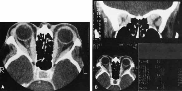 side in 50%.75 The most characteristic CT finding in thyroid orbitopathy is enlargement of the extraocular muscles, which is usually bilateral and symmetric and has a fusiform configuration, with sharply defined borders and sparing of the tendinous insertions. Atypical cases with tendon involvement and blurred muscle margins have been described.75 The pattern of muscle enlargement on CT parallels that seen clinically. The inferior rectus is the most commonly involved, followed by the medial rectus, superior rectus, and lateral rectus. Other findings include proptosis and anterior prolapse of the orbital septum due to excessive orbital fat and muscle swelling (see Fig. 4).76 Also, lacrimal gland enlargement and bone remodeling without erosion can occur.75 Patients at risk for developing optic neuropathy may also have severe apical crowding, a dilated superior ophthalmic vein, and anterior displacement of the lacrimal gland.68 Of these, apical crowding is the most sensitive indicator for the presence of optic neuropathy (Fig. 5A).56 Both axial and coronal CT cuts should be obtained; the coronal plane is needed to assess the enlargement of the extraocular muscles at the apex (see Fig. 5B). |