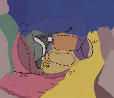 to work and function properly. BONY DECOMPRESSION Bony orbital decompression for TO was first reported by Dollinger155 in 1911, using the lateral orbitotomy approach of Kronlein. Since then, many different techniques involving one to four orbital walls have been described156–161 (Fig. 6). Walsh and Ogura162 popularized a transantral approach in the mid 1950s to remove the floor and medial orbit, which became the standard of care for orbital decompressions for many years. The transorbital (via fornix or eyelid) approach to inferior and medial wall decompression became the most common approach used by ophthalmologists in the mid-1980s and early 1990s.163–167 The medial wall can also be approached transcaruncular or via an endoscopic endonasal approach. Removal of the lateral wall, popular in the early 1900s, showed resurgence of interest in the 1980s, with reports of extended lateral wall removal.161,168 The addition of a lateral wall advancement,169 with outward rotation of the lateral orbital wall, had the advantage of further increasing both the orbital volume and simultaneously improving upper eyelid retraction. The current popular techniques are deep lateral bony removal and the “balanced” orbital decompression with symmetrical decompression of the medial and lateral walls with preservation of the orbital floor to minimize complications involving muscle imbalance.170,171 The deep lateral bony decompression involves removing the posterior lateral wall overlying the temporal loose dura, including the deep portion or “trigonal bone” of the greater wing of sphenoid, which has a highly vascular marrow space.161,168,171,172 The deep lateral wall can be assessed through a coronal, lateral cutaneous or lateral transconjunctival approach. The mean retroplacement of the globe with isolated deep lateral decompression is approximately 3.5 mm (range 0.5 to 6 mm), with a two-wall decompression is about 5 mm (range 3–8 mm), and with a three-wall technique the range is between 5 and 10 mm.152,167,171,173–176 It is important to remember, however, that proptosis and vision improvement are, to a great extent, independent of each other. Visual rehabilitation depends on removal of bone at the orbital apex. In a large retrospective study of 205 eyes with visual acuity of 20/40 or worse from optic neuropathy, acuity improved following transantral decompression of the medial wall and floor by three Snellen lines or more in 110 (54%), and visual field defects resolved in 120/291 (41%) and improved in 126/291 (43%).69 Two percent of patients lost more than three Snellen lines of visual acuity after orbital decompression.69 In a retrospective review, 25 of 28 (89%) undergoing endoscopic and transconjunctival medial wall and floor decompression for CON showed improvement, with 43% having greater than six lines of vision improvement.177 In a retrospective study of 33 patients undergoing translid inferior and medial wall decompression for optic neuropathy, visual acuity improved and remained stable in 58%, visual improved but was then followed by subsequent deterioration in 36%, and in 2/33 patients vision deteriorated and did not improve. Visual function stabilized within 12 months of surgery in 76% and within 18 months in 91% of patients.178 There is no doubt that decompression can cause or worsen muscle imbalance, and, therefore, orbital decompression, if required, should precede any strabismus surgery. Various factors may influence the incidence and severity of postoperative strabismus: preoperative myopathic state, the degree of “apical crowding,” asymmetric herniation of orbital contents after orbital decompression, and variations in surgical techniques. Rates of new onset of postoperative diplopia in primary position are between 30% and 65% with the transantral approach,179,180 although this may be greatly reduced by incising periorbita in the anterior–posterior direction from the equator of the globe and perpendicular to this anteriorly59 or by not incising the anterior periorbita at all.181 Leaving the medial orbital strut of bone at the maxillary-ethmoid junction also minimizes diplopia182 (Fig. 6). Compared with transantral decompression, a lesser incidence of iatrogenic diplopia is observed after coronal or transorbital orbital decompressions.175 New onset of postoperative diplopia in primary position is between 5% and 25% with the transorbital approach to the removal of the medial wall and floor173,183,184 and 9% to 20% after coronal decompression.173,175 Patients with restricted ocular motility preoperatively are more likely to have postoperative diplopia; in a series of patients undergoing transconjunctival orbital floor and transcutaneous medial wall decompressions, Nunery176 found 4% (1/25) patients without preoperative diplopia or abnormal versions develop postoperative diplopia compared with 61% (22/36) patients developing new or worsening of diplopia in primary position with preoperative restrictive motility loss and diplopia within 20 of primary position. Reports of new onset of diplopia after balanced medial and lateral decompression with or without orbital fat removal range from 0%185 to 18%.186,187 Resolution of preexisting diplopia after orbital decompression has been reported in up to one-third of patients.173,188 Reported complications following decompression surgery include infraorbital nerve anesthesia, which resolves in most patients within 4 to 6 months; anesthesia in the distribution of the zygomaticotemporal and zygomaticofacial nerves; cerebrospinal fluid leaks, most of which seal spontaneously; intracranial bleeding, meningitis, nasolacrimal duct obstruction; and 1% loss of vision.69,160,171,189,190 ORBITAL FAT DECOMPRESSION Orbital fat decompression was first proposed by Crawford191 in 1973 to relieve the apical compression on the nerve by the enlarged extraocular muscles. This technique was then ignored until a resurgence of interest followed Olivari's192 