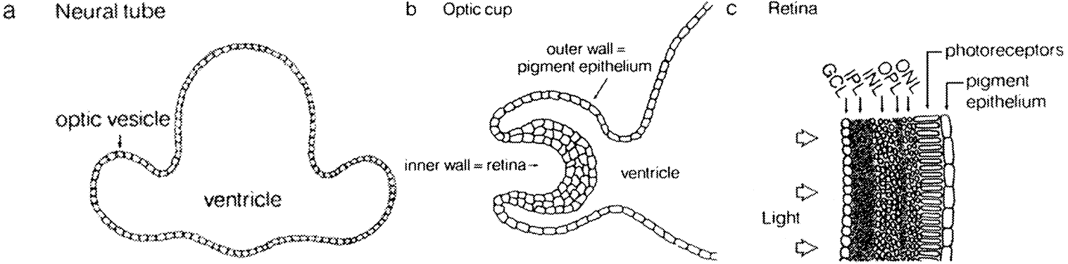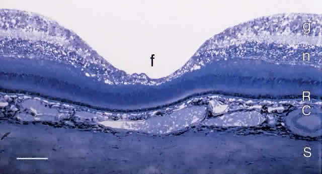 The retina comprises tissues derived from the optic vesicle, an outgrowth from the diencephalon at approximately 25 days in fetal development (Fig. 1). The optic vesicle invaginates during the fourth fetal week to form a cup, the inner wall of which differentiates into the multilayered neurosensory retina (Fig. 2). The outer wall of the cup becomes the pigment epithelium. |