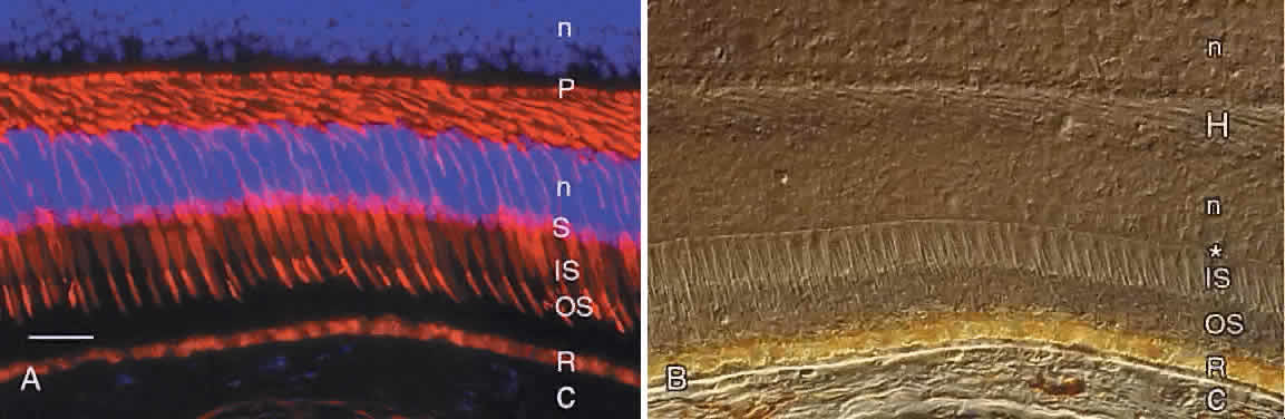 The RPE secretes some of the molecules that fill the subretinal (interphotoreceptor) space. This space, the remnant of the ventricular lumen present during fetal development, is delineated by the apical surfaces of the photoreceptor, Müller, and RPE cells. The outer margin of the space is established by the zonulae occludentes (tight junctions) between the RPE cells, and the inner margin is defined by the external limiting membrane, formed by intermediate junctions (zonulae adherentes) between photoreceptor inner segments and Müller cell apical processes.7 This space is filled with the interphotoreceptor matrix, a heterogeneous collection of proteins/glycoproteins, enzymes, and glycosaminoglycans/proteoglycans that surround the rod and cone inner and outer segments. Notable components of the interphotoreceptor matrix are interphotoreceptorretinoid binding protein (see Fig. 4B), though to function in transport of vitamin A between photoreceptors and the RPE,4 and the matrix sheaths that surround individual rod and cone outer segments. The matrix sheaths of rods and cones differ in composition: those of the rods are stained by certain plant lectins, notably wheat germ agglutinin, while the cone sheaths are positive with other lectins, including peanut agglutinin (see Fig. 4C). The sheaths of the specialized foveal cones are labeled with wheat germ agglutinin and elderberry bark lectins. These matrix sheaths are thought to isolate individual photoreceptor outer segments, maintain outer segment orientation, and contribute to attachment of the photoreceptors to the apical surfaces of the RPE cells.8 |