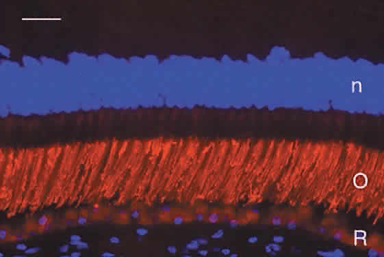 layer of photoreceptor axons and synapses (see Fig. 5B). Humans have a single type of rod with a long, thin outer segment containing the visual pigment, rhodopsin, which absorbs maximally at 500 nm. The cone outer segments are shorter and wider and somewhat conical. Each of the three cone types contains a different cone opsin that absorbs maximally in the red (564 nm; L cones), green (533 nm; M cones), or blue (437 nm; S cones) region of the spectrum. The visual pigments can be demonstrated by immunocytochemistry using antibodies specific for the different proteins. Rod outer segments are strongly labeled with anti-rhodopsin (Fig. 6). The composition of the red cone pigment is so similar to that of the green cone pigment that they cannot be differentiated by immunocytochemistry, but the majority of cone outer segments are labeled with an antibody that recognizes both red- and green-sensitive cones (Fig. 7A). A minority of the cones are blue-sensitive (see Fig. 7B).