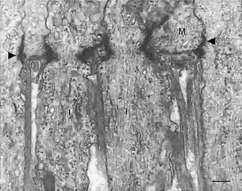 The outer plexiform layer contains the synapses of the rod and cone photoreceptors onto dendrites of the horizontal and bipolar cells (Fig. 14). The rod synapses are oval and termed spherules. The cone terminals are broader and referred to as pedicles. The cone pedicles form a row internal (vitread) to the rod spherules. The outer plexiform layer is thickest in the macula, containing axons of the rods and cones that course radially from the fovea, constituting the fiber layer of Henle. Both rod and cone synapses contain synaptic ribbons and vesicles. The rod and cone terminals are organized as invaginating synapses, termed triads, each containing a single presynaptic ribbon, two lateral processes from horizontal cells, and a single central process from a bipolar cell. Each rod spherule contains a single triad; each cone pedicle contains several triads. Cone pedicles also have small synapses on their surfaces called flat synapses. These originate from “off” cone bipolar cells and are not associated with synaptic ribbons. Small lateral gap junctions are also found between rod and cone terminals, but these are not associated with synaptic vesicles. |