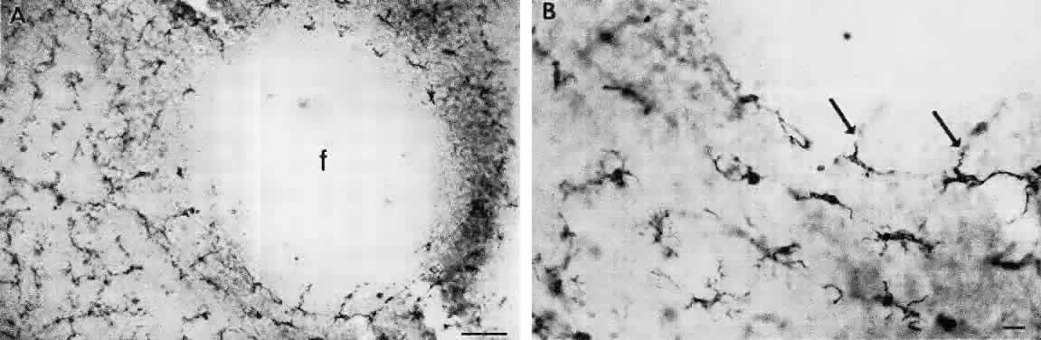 of blood vessels in the inner retina. For many years, the Müller cells were thought to function mainly for structural and metabolic support of the retinal neurons. Recent studies have disclosed additional Müller cell functions, including regulation of extracellular potassium levels, uptake and degradation of neurotransmitters, and regulation of CO2 and pH levels in the retina.23 Müller cells also contain several binding proteins for vitamin A, suggesting that they may play a role in the visual cycle.4,24 ASTROCYTES As in brain, the astrocytic glia are stellate cells with oval nuclei. Their cell bodies are located mainly in the nerve fiber layer, with a few in the ganglion cell layer. The astrocytes can be demonstrated by immunocytochemistry with an antibody against glial fibrillary acidic protein (Fig. 17). The astrocytes are prominent in the prelaminar portion of the optic disc, and wide astrocytic foot processes surround the walls of the retinal blood vessels. MICROGLIA These stellate cells form regular mosaics in the interfaces between the nerve fiber and ganglion cell layers and the inner nuclear and outer plexiform layers.25 The microglia are tissue macrophages derived from the bone marrow. They are closely associated with the retinal blood vessels and are absent from the avascular foveal pit (Fig. 18). The microglia can be demonstrated with CD45 and HLA-DR leukocyte markers.26 The microglia become activated in damaged or degenerating retinas, where they function as scavengers of debris and may function to present foreign antigens to T lymphocytes.27 |