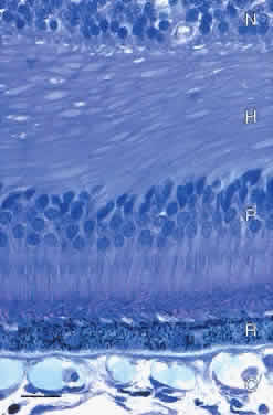 The outer nuclear layer contains the cell bodies and nuclei of the rods and cones (see Fig. 2). In the parafovea, the outer nuclear layer contains 8 to 10 rows of nuclei that belong mainly to cones. In the remainder of the retina, the outer nuclear layer contains five rows of nuclei, with a single, outermost row of cone nuclei and four rows of rod nuclei internal to them.11 The rod nuclei are smaller and contain denser chromatin than those of the cones. |