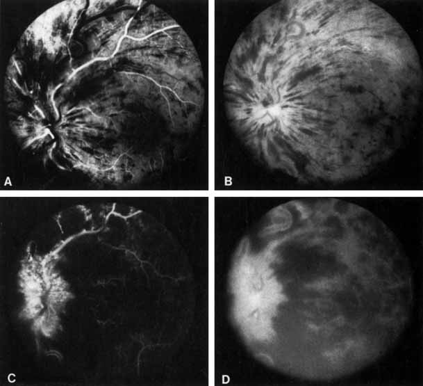 Neovascularization of the iris and frequently neovascular glaucoma occurs in approximately 8%62 to 25%65,66,73,88 of all central retinal vein occlusions and generally only in those eyes that exhibit an ischemic pattern of occlusion.63,65,66,68,89 Magargal and co-workers70 have shown that the incidence of neovascularization increases dramatically above approximately 50% capillary nonperfusion. The incidence of anterior segment neovascularization in nonischemic central retinal vein occlusion is approximately 1%, compared with approximately 35% to 45% for ischemic central retinal vein occlusion.63,69,70,89 Neovascularization of the iris or angle is significantly correlated with the extent of capillary nonperfusion on the fluorescein angiogram.73,89 In the series of Sinclair and Gragoudas,73 rubeosis developed in 80% to 86% of the eyes with severe nonperfusion of three to four quadrants of the posterior pole or the periphery, but in only 3% to 9% of those with less capillary nonperfusion. Abnormalities on fluorescein angiography of the iris appear not to be correlated with the development of secondary glaucoma in ischemic central retinal vein occlusion.325 Neovascularization of the iris may develop as early as 2 weeks after central retinal vein occlusion or as late as 2½years.2,65,89 Neovascularization of the iris, when it does occur, will develop in almost all patients within the first year, but usually in the first 3 months.89 Symptomatically, patients complain of tearing, irritation, pain, and further blurring of vision as the intraocular pressure in the affected eye begins to rise. The pain may become excruciating. The cornea is hazy and the pupil dilated, and a network of fine vessels is seen over the surface of the iris (rubeosis iridis) on slit-lamp examination. By the time gonioscopy reveals extension of this neovascular membrane into the trabecular network and throughout the angle, the intraocular pressure is usually markedly elevated. The angle is initially open, but later in the disease, peripheral anterior synechiae develop and the angle may become irreversibly closed, resulting in neovascular glaucoma. Large, extremely irritating bullae may form on the surface of the cornea and then break down. Dense cataracts eventually form, obscuring the fundus. Nonperfusion in central retinal vein occlusion is also correlated with a relative afferent pupil defect.76,90,91 Servais and colleagues90 found that 100% of a group of patients with unilateral ischemic central retinal vein occlusion had a relative afferent pupil defect, whereas only 31% of patients with nonischemic occlusion had such a defect. Hayreh and associates76 believe that relative afferent pupil defect is the most reliable test for ischemic central vein occlusion in patients with unilateral disease (i.e., fellow eye is normal). Hikichi and co-workers examined eyes with a central retinal vein occlusion and the presence or absence of a posterior vitreous detachment.350 They found that a complete posterior vitreous detachment appears to protect against retinal or disc neovascularization, although not iris neovascularization, and that vitreomacular attachment contributed to persistent macular edema in nonischemic central retinal vein occlusion.350 Besides having the complications already discussed, patients with central retinal vein occlusion are also at risk for vascular occlusion in the contralateral eye. Approximately 6% to 17% of patients can be expected to have a bilateral nonsimultaneous central retinal vein occlusion.92–95 Mieler and Blumenkranz95 followed 79 patients with central retinal vein occlusion for a minimum of 5 years. In 25% of these patients, the contralateral eye developed a vascular occlusion within 5 years; of these, 50% were branch retinal vein occlusions, 30% were central retinal vein occlusions, 10% were central retinal artery occlusions, and 10% were branch retinal artery occlusions. There is some doubt as to whether the life expectancy of patients with a central vein occlusion is shortened96 or not97 compared with an age-matched population. Occasionally a patient will have a simultaneous occlusion of both the central retinal vein and the central retinal artery.98,99 Unlike patients with only a central retinal vein occlusion, these patients often have some retrobulbar pain, and vision may be decreased to no light perception. The retina appears pale, with a cherry-red spot in the macula. Disc edema and retinal hemorrhage may be present. Fluorescein angiography will demonstrate occlusion of both the central retinal vein and the central retinal artery. In the recovery phase, optic atrophy develops, and extreme narrowing of the retinal arterioles occurs.98 Although rare, an occlusion of the cilioretinal artery may also be seen in conjunction with central retinal vein occlusion.18,100–103 Patients with this occurrence have a pallor typical of ischemia in the distribution of the cilioretinal artery; fluorescein angiography will confirm occlusion of the cilioretinal artery. Occlusion of the cilioretinal artery may be due to a relative hypoperfusion caused by the increased venous pressure.103 The visual acuity, in general, is no worse than in a pure central retinal vein occlusion.99 Simultaneous occlusion of the central retinal vein and a branch retinal artery has been reported in a few patients.104 The electroretinogram is abnormal in patients with central retinal vein occlusion, and one or more of the electroretinographic parameters can be used to group patients in terms of having either an ischemic or a nonischemic vein occlusion.77,106 Some investigators believe that the initial electroretinogram can be used as a predictor of anterior segment neovascularization in patients with central retinal vein occlusion,107–110 whereas others do not consider it useful in this regard.106 In a large study of patients with unilateral central retinal vein occlusion and an apparently normal contralateral eye, 36% of pa