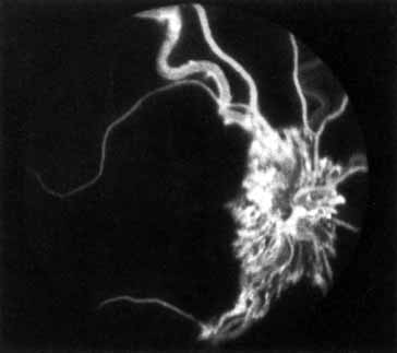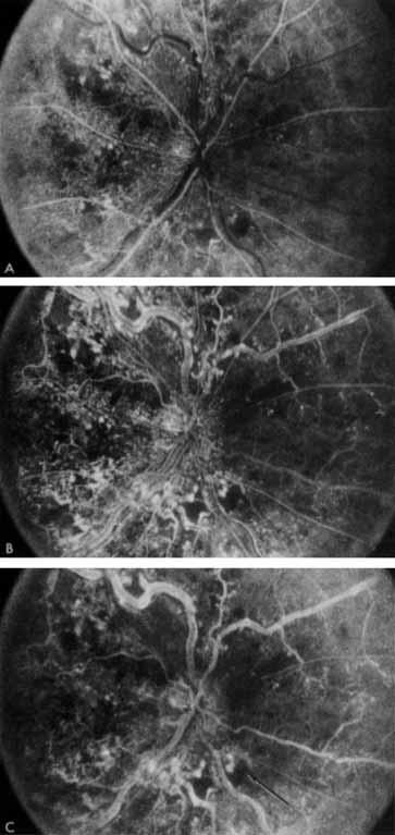 The prognosis for ischemic central retinal vein occlusion is generally poor because of decreased visual acuity and neovascularization. Visual loss occurs because of macular edema, capillary nonperfusion, overlying hemorrhage (either retinal or vitreal), or a combination of all these. Retinal edema usually gradually subsides except in the macula, where it may persist for many months or years. Macular holes or cysts may form.83,84 Pigment clumping or fine pigment stippling and pigment atrophy are not uncommon, and persistent macular hemorrhage, even years after the occlusion, has been noted.83 Hard exudates often form an irregular circinate configuration around the macula and become more prominent months later. Occasionally an epiretinal membrane may form. In the chronic phase, most hemorrhages gradually disappear over many months; however, scattered, flame-shaped hemorrhages and dot hemorrhages, particularly in the periphery, may be seen for years. Cotton-wool patches and microaneurysms likewise tend to disappear after several months, although in some cases the latter may persist. The venous tree becomes less tortuous and dilated. Prominent venous loops, which are collateral communications, may be observed on the surface of the disc (Fig. 6).85 These loops develop within 3 to 14 months after occlusion from the existing retinal vasculature and are collateral vessels between the obstructed disc capillaries and the unobstructed choroidal or pial capillaries.323 These retinochoroidal collateral veins, if they develop, may protect against anterior segment neovascularization,328 but may not be associated with a better visual prognosis.105 Collaterals between the central retinal vein within the globe and the patent central retinal vein behind the occlusion have not been observed.86 The extent and speed of retinal recovery probably depends to some degree on how quickly collateral vessels form, how rapidly recanalization occurs, and how adequately these compensatory mechanisms restore normal outflow. However, the exact nature and course of the collateral vessels are disputed. Anastomotic channels may develop within the retinal vasculature if pressure differentials develop between its major venous trunks. Changes in the retinal arterioles include both segmental and generalized narrowing as well as sclerosis, which is evidenced by both sheathing and widening of the light reflex. Sheathing of the veins is also common. The disc may appear nearly normal except for sheathing of the vessels in and around the papilla, and some blurring of the margins may persist. Sometimes optic atrophy is present. The fluorescein angiographic appearance varies greatly, depending on the extent of recovery. All the findings in the acute phase, consisting of venous and capillary engorgement, microaneurysms, staining of the veins, patchy extravascular fluorescence, and capillary nonperfusion, may persist indefinitely. In most instances, these findings eventually diminish so that few significant features are present on the angiogram; collateral vessels, if present, may be the only pathognomonic feature. The most serious complication of central retinal vein occlusion is neovascularization (Table 2). Neovascularization elsewhere (NVE) occurs less frequently than neovascularization of the iris (NVI), and usually only in ischemic occlusions.66 The low incidence of retinal surface neovascularization in ischemic central retinal vein occlusion is thought to be due to the destruction of endothelial cells, which provide the source for endothelial proliferation and neovascularization.87