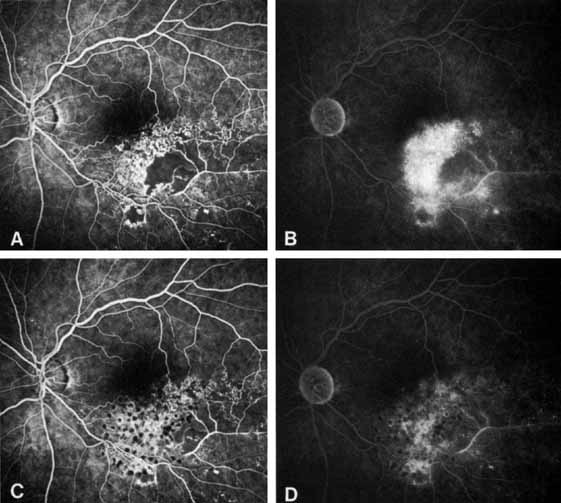 Thus the data on the study is very likely skewed toward a lack of treatment effect.164 In addition, of the eyes in the early-treatment group, three received only 500 to 600 spots (size not specified), even though the protocol called for at least 1,000 spots,89 and the median number of spots in the entire treatment group was only 1,203.89 Would more complete treatment have reduced the incidence of anterior segment ischemia in the early-treatment group, therefore producing a significant treatment effect? There was a significant correlation between the amount of nonperfused retina at baseline and the development of anterior segment neovascularization.89 Although only 16% of the eyes with 10 to 29 disc areas of capillary nonperfusion at baseline developed anterior segment neovascularization, 52% of the eyes with more than 75 disc areas of neovascularization developed neovascularization.89 Would eyes with the greatest number of risk factors (i.e., greater than 30 disc areas of nonperfusion, retinal hemorrhages greater than the standard photograph, duration of central retinal vein occlusion less than 1 month, and male sex) have benefited from prophylactic panretinal photocoagulation? Hayreh and associates163 conducted a prospective nonrandomized study of panretinal photocoagulation in ischemic central retinal vein occlusion. They found no statistically significant difference between the treated and untreated groups in the incidence of angle neovascularization, neovascular glaucoma, retinal or optic nerve neovascularization, vitreous hemorrhage, or visual acuity. The only significant finding was that fewer patients in the treated group had neovascularization of the iris compared with nontreated controls, but only if the panretinal photocoagulation was applied within the first 3 months after the onset of central retinal vein occlusion163 and panretinal photocoagulation resulted in a significant loss of the peripheral field. However, the patient selection for treatment in this study was not based on a random assignment, but the decision as to whether to perform laser or not was “left entirely to the patient,”320 and this may been a source of bias in terms of the results of the study.265 Once neovascularization in the anterior segment is detected, panretinal photocoagulation should be instituted promptly. This will often result in regression of the iris vessels and prevent complete angle closure; this is also true in patients with some increase in intraocular pressure but in whom the angle is not occluded for 360°. Once developed, neovascular glaucoma responds poorly to any type of treatment. Cycloplegics, topical pressure-lowering agents, carbonic anhydrase inhibitors, and corticosteroids, though failing to lower the intraocular pressure significantly, may make the patient more comfortable. Panretinal photocoagulation often cannot be applied in cases of advanced neovascular glaucoma in which the angle has been substantially occluded and the cornea may be too cloudy to allow treatment. Transscleral cyclocryotherapy or transscleral laser cyclodestruction, sometimes combined with 360° of transscleral panretinal cryoablation,165,166 has also been used to preserve the globe. In some cases in which visibility is poor and the angle is closed, we have had some success combining pars plana vitrectomy and endophotocoagulation with a drainage implant (e.g., Molteno, Ahmed) inserted through the pars plana. Macular edema, a frequent complication and cause of loss of visual acuity in patients with nonischemic central retinal vein occlusion, has been treated with macular grid photocoagulation.167 The rationale is that grid photocoagulation of the macula is effective in reducing macular edema in branch retinal vein occlusion168 and diabetes mellitus.169 The Central Retinal Vein Occlusion Study Group performed a randomized, prospective clinical trial on the effect of macular grid photocoagulation compared with no treatment on eyes with 20/50 or worse visual acuity due to macular edema with no capillary nonperfusion on fluorescein angiography.170 Although grid photocoagulation lessens macular edema both angiographically and clinically, there was no difference in visual acuity between the treated and untreated patients. For treated patients, there was a trend toward decreased visual acuity in patients older than 60 years and visual improvement in patients younger than this; this effect was not seen in untreated patients. Although this study suggests a possible benefit to visual acuity in younger patients with macular edema who are treated compared with untreated controls, the number of patients in this subgroup is too small for a statistically valid comparison of treated versus untreated eyes. Unfortunately, a study with an adequate number of patients has not been performed to determine whether photocoagulation would be of benefit for younger patients with macular edema in nonischemic central retinal vein occlusion. McAllister and Constable171 reported a surgical technique to create a chorioretinal anastomosis in patients with nonischemic central retinal vein occlusion. The technique is to rupture Bruch's membrane first in an area adjacent to the edge of a vein located at least three disc diameters from the optic disc with the argon laser; they then use a YAG laser to create a small opening in the sidewall of the adjacent vein. In their original report there was an average of 2.1 attempts to create an anastomosis, which was successful in only 42% of the patients in the first series171 and 54% in a subsequent report.332 In the first series, ischemic central vein occlusion did not develop in any of the patients in whom a successful anastomosis was produced, but it did develop in 31% of patients in whom such an anastomosis could not be created.171 All the patients with a successful anastomosis had an improvement in final visual acuity compared with pretreatment visual acuity. In the group of patients with an uns
