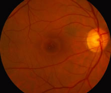 anatomic fovea and, primarily, the foveola of the eye. It may be associated