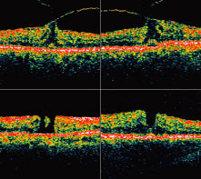laser aiming-beam test. The Watzke-Allen test is performed at the slit-lamp biomicroscope by using a macular lens and placing a narrow vertical slit beam through the fovea. A positive test is noted when the patient detects a break in the bar of light. Most patients with a full-thickness macular hole report a positive Watzke-Allen test.21 The laser aiming-beam test is performed similarly using a macular lens and placing a 50 μm laser-photocoagulator aiming beam within the presumed macular hole. A positive test is observed when the patient cannot detect the aiming beam within the lesion but is able to detect it in surrounding intact tissue. This test is possibly more sensitive and more specific for full-thickness macular holes.22 Recently, OCT has shown great potential in the diagnosis of macular disease, including macular hole.23,24 OCT may be even more sensitive than contact lens biomicroscopy in detecting certain macular lesions.25 Other diagnostic tests are generally less useful in detecting macular holes or distinguishing between macular holes and other simulating lesions. Amsler grid abnormalities are sensitive to macular lesions but are not specific to macular hole lesions. Macular holes do not cause absolute scotomas detectable by Amsler grid testing.26 Fluorescein angiography may demonstrate early central hyperfluorescence in both true holes (79%)27 and pseudomacular holes (63%),28 and therefore is generally not a useful adjunct in distinguishing these lesions. Likewise, B-scan ultrasonography is generally not sensitive enough to distinguish macular holes from masquerading lesions. |