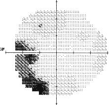 holes40, nor does it recommend the use of adjuvant therapy during surgery. The standard surgery for repair of macular hole was described by Kelly and Wendel58 in 1991 and involves a standard three-port pars plana vitrectomy, with removal of cortical vitreous and any epiretinal membrane. The surgical goal is to remove enough of the surrounding membrane, when present, to relieve traction that could prevent flattening of the edges of the macular hole. A total air-fluid gas exchange is performed to desiccate the vitreous cavity; this is followed by a gas-air exchange using a nonexpansile concentration of a long-acting gas (e.g., 16% C3F8).59 Strict face-down positioning to encourage contact of the gas bubble against the macular hole for at least 1 week (and as long as 3 or 4 weeks) is as important as the technical components of the procedure. This requirement may be difficult or impossible for some patients to comply with and may be a consideration in determining surgical candidacy. One pilot study, however, has suggested that comparable anatomic success may be achieved without such rigorous positioning.60 There is considerable debate regarding adjunctive therapy in macular hole repair. Additives applied to the site of the macular hole in hopes of stimulating a cellular reparative response have included autologous serum,61 autologous platelet concentrate (APC),62 thrombin-activated fibrinogen,63 thrombin,64 transforming growth factor beta-2 (TGFΒ2),65 and tissue glue.66 Of these, well-designed controlled trials, or cohort or case-control analytic studies, have been reported only for TGFΒ2,67,68 and APC.69 Though promising, the data on these adjuvants are sometimes conflicting, and it is too early to make specific recommendations regarding their use. Another potentially helpful adjunct to the repair of macular holes is peeling of the internal limiting membrane (ILM) at the time of surgery.63 The ILM can be removed using a microbarbed microvitreoretinal blade or diamond-dusted silicone cannula to create a surgical plane, which is then stripped with fine end-gripping tissue forceps. The evidence regarding the potential benefit from this procedure, however, remains equivocal. Some studies suggest that ILM peeling improves both anatomic and visual success rates.70,71 In contrast, Margherio and colleagues72 used a large retrospective cohort study to compare patients with and without preretinal/ILM peeling and concluded that there was no statistically significant difference between the two cohorts. In addition, complications from ILM peeling include longer surgery time (and thus greater phototoxicity), perifoveal capillary bleeding, and retinal whitening.71 Intraocular indocyanine green (ICG) dye has recently been used to facilitate the visualization of the ILM during peeling procedures. ICG staining improves the visibility and, thus, the ease of stripping of the ILM, but recent studies suggest that it may also cause retinal damage.73,74 The long-term sequelae of ICG staining remain unknown. The success rate of macular hole surgery has improved dramatically since the landmark pilot study reported by Kelly and Wendel58 in 1991. This initial article reported a 58% anatomic success rate, with 73% of these patients showing an improvement in visual acuity of two lines or better (42% overall). Recent reports on acute (less than 6 months) idiopathic macular holes are showing anatomic success rates from 89% to 100% and improvement in visual acuity of two or more lines in 72% to 95% of patients.71,72,75 There are several well-described complications that may occur after macular hole repair. Acute complications include retinal tears76 and endophthalmitis.77,78 Long-term complications include nuclear sclerotic cataract in the vast majority of phakic patients,79 and retinal detachment in 1% to 3% of patients.77,78 In addition, there is a 2% to 10% risk of a repaired macular hole reopening at a later date.80–82 Less frequent surgical complications that have been reported include enlargement of the hole,77 photic toxicity or retinal pigment epithelial alterations,83,84 exudative retinal detachment,85 glaucoma,86 proliferative vitreoretinopathy,87 and dense wedge-shaped temporal visual field defects (likely resulting from dehydration injury during fluid-air exchange, Fig. 9).88,89