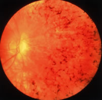 areas of atrophy can be seen205 and patients usually become virtually blind between the ages of 40 to 55 because