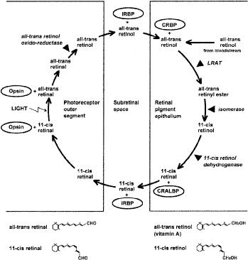 be recorded that are as low as 1 μV to 0.5-Hz flashes of white light (normal Among 94 patients, ages 6 to 49 years, with the common forms of retinitis pigmentosa, full-field ERGs declined significantly over a 3-year interval in 66 of 86 patients (77%), with detectable responses at baseline. Patients lost on average 16% of remaining full-field ERG amplitude per year to single flashes of white light (95% confidence limits, 13.1% to 18.6%) and 18.5% of remaining amplitude per year to 30-Hz white flicker (95% confidence limits, 15.1% to 21.5%). Patients lost on average 5.2% of remaining foveal cone ERG amplitude per year, indicating that loss of retinal function was primarily extrafoveal in these patients. They lost on average 4.6% of remaining visual field area per year in the Goldmann perimeter with a V-4e white test light, whereas visual acuity and dark-adaptation thresholds remained relatively stable. Bone spicule pigment increased in 54% for whom comparisons could be make over a 3-year interval, suggesting that observation of increased pigmentation as a means of following this condition is not as sensitive as full-field ERG testing.46 Caution must be exercised in applying these population ERG results to predict longitudinal patterns in individual patients, because standard deviations derived from standard errors have revealed considerable variation around the mean for these patients.46 However, these results, describing the natural course on a quantitative basis, provide a frame of reference for planning interventions in similar populations to stabilize or slow the course of retinitis pigmentosa, particularly if monitored with full-field ERG testing. MOLECULAR GENETIC STUDIES Substantial genetic heterogeneity exists among patients with retinitis pigmentosa with abnormalities in over 25 genes identified as of 2001; an updated list is maintained on the RetNet site (http://www.sph.uth.tmc.edu/Retnet/sum-dis.htm). Genes so far identified as causes of nonsyndromic retinitis pigmentosa, as well as Usher syndrome, are given in Table 2.48–87 Molecular genetic analyses have revealed defects in genes encoding proteins involved in the phototransduction cascade (Fig. 7), the retinoid cycle (Fig. 8), and structural components of photoreceptors, as well as in photoreceptor and retinal pigment epithelial proteins with unknown functions.