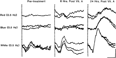 stages of retinitis pigmentosa. The previous classification of these diseases was based on the family of origin (e.g., Nougaret type), by the original description of the ERG waveforms associated with the condition (e.g., Riggs type or Schubert-Bornschein), or by the ophthalmologist who first described the disease (e.g., Oguchi disease). These diseases are now being reclassified by molecular genetic analysis.247 Missense mutations in three different genes encoding members of the rod phototransduction cascade have been reported to cause dominantly inherited stationary night blindness. Specifically, the mutations are the Ala292Glu and Gly90Asp mutations in rhodopsin,248,249 the His258Asp mutation in the β-subunit of rod phosphodiesterase,250 and the Gly38Asp mutation in the α-subunit of rod transducin.251 The latter mutation has only been seen in the descendants of Jean Nougaret. Although the Ala292Gly rhodopsin mutation apparently causes a complete loss of rod function (i.e., Riggs type),248 the other mutations cause an incomplete loss of rod function.251,252 Some evidence exists from psychophysical and ERG testing that the rods are constitutively active in the dark in some forms of stationary night blindness. This has been suggested for patients with the rhodopsin, Gly90Asp mutation.249 The ERG abnormalities in patients with the Gly38Asp mutation in the α-subunit of rod transducin can be simulated by light adapting the normal retina, compatible with the idea that these patients have mutant rod transducin that is constitutively active in the dark.252 Further evidence that these patients have rod photoreceptors despite their night blindness is provided by fundus reflectometry studies that have shown normal levels of rhodopsin and normal rhodopsin kinetics.253 Oguchi disease is a recessively inherited form of stationary night blindness. Following 1 hour of dark adaptation, patients with Oguchi disease have no rod b-wave in response to dim blue light flashes, a cornea-negative response to white light, and a normal cone response to 30-Hz white flicker. Following complete dark adaptation after 12 hours, some patients have a normal rod b-wave amplitude and normal rod b-wave implicit time but only in response to one or two flashes of light.254 Apparently the test flash used to elicit the ERG, although relatively dim, can be intense enough to light adapt the rod system. Molecular genetic analyses have shown a null mutation, Asn309(1-bp del), in the gene encoding arrestin in some patients of Japanese descent.255 Several null mutations have also been described in the gene encoding rhodopsin kinase in some patients of Eastern European descent.256 Both arrestin and rhodopsin kinase participate in the deactivation of photoactivated rhodopsin. The lack of either arrestin or rhodopsin kinase would be expected to have the same physiologic effect, namely the prolongation of photoactivated rhodopsin with a consequent abnormality in rod sensitivity. Fundus albipunctatus is another form of recessively inherited stationary night blindness.257,258 Patients with fundus albipunctatus have a delay in rod visual pigment and foveal cone pigment regeneration, as monitored with fundus reflectometry.257 Changes in visual pigment levels parallel the prolonged cone and rod limbs of the dark-adaptation curve. Full-field ERGs have been found to be normal with respect to both cone and rod amplitudes and b-wave implicit times after full dark adaptation.258 The findings in fundus albipunctatus suggest an abnormality in visual pigment regeneration secondary to some abnormality in the relationship between the photoreceptors and the pigment epithelium. The composition of the yellow-white lesions and their relationship to the abnormality in visual pigment regeneration are not known. Patients with this condition have been observed to have defects in the gene encoding 11-cis retinol dehydrogenase.259 A form of stationary night blindness for which the precise gene defect remains unknown is congenital nyctalopia with myopia. This condition (i.e., Schubert-Bornschein type) is inherited by either an X-linked or autosomal recessive mode.260–262 The extent of the myopia is characteristically -3.5 to -14.5 diopters (D). Patients cannot attain normal dark-adapted rod thresholds and have fundus findings of myopia. Their rod ERG b-wave responses to dim blue light are nondetectable, and the patients have a characteristic cornea-negative response to white light in the dark-adapted state and normal or nearly normal cone responses to 30-Hz white flicker. The preservation of the a-wave from the rod photoreceptors with loss of the b-wave from neurons proximal to the photoreceptors suggests some abnormality in intraretinal transmission of the response from the rod photoreceptors to proximal retinal cells. ERG amplitudes are reduced in congenital nyctalopia with myopia compared with those from normal emmetropes; this probably occurs because of the known reductions of ERG amplitude seen in patients with moderate axial myopia as the only finding.263 The ERG abnormality in congenital nyctalopia with myopia has been reported as an acquired defect in patients with cutaneous malignant melanoma, who have an acute onset of night blindness with selective reduction in the rod b-wave response264 (Fig. 18). Development of an antibody to the melanoma that also reacts to retinal cells with an interruption in rod signal transmission has been considered as a probable mechanism to account for the sudden onset of night blindness in patients with this paraneoplastic retinopathy. Patients with congenital nyctalopia have been further subdivided into two groups designated as the complete or incomplete form of the condition based on dark-adaptation measures and ERG amplitudes. In the complete form, the rod a-wave is normal, whereas the rod b-wave is absent and responses are mediated by the cone system. In the incomplete form, rod ERG responses, although reduced in am