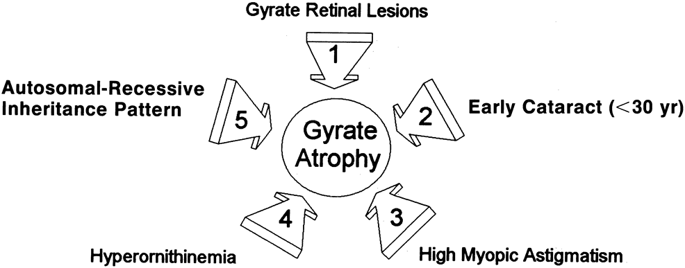 Other: Francois48 reported an association of Alder's anomaly (the presence of numerous azurophilic granules in the cytoplasm of neutrophils, which stain dark violet by Pappenheim's technique) with GA in one patient. However, Alder's anomaly has generally been associated with Hurler syndrome and has not been reported in association with GA by other investigators. In a study performed at the U.S. National Eye Institute, and therefore not expected to deal with a homogenous genetic population (as one might find with Finnish GA patients), an increased occurrence of thyroid disease in patients with GA compared with control patients was found by Whitcup and colleagues.49 Seven of 34 patients with GA had thyroid disease, resulting in an estimated odds ratio for thyroid disease in GA patients of 12.7 that of normal controls. Similar but less pronounced results were found in retinitis pigmentosa patients, with an estimated odds ratio of 6.2 compared with normal controls. ANIMAL DATA Hepatic mitochondrial changes similar to those seen in patients with GA have been produced in normal rats maintained on high-ornithine diets.50 A case of an adult male cat with retinal degeneration, extreme hyperornithinemia, and absence of OAT—an apparent replica of human GA—was reported by Valle and associates.51 Attempts to breed the cat were unsuccessful, and it later died. Histopathologic examination of the cat's eyes demonstrated extensive neuroretinal and RPE damage and cell loss. There was a decrease in the number of small choroidal vessels, but not the large ones. In cats with other retinal degenerations, such loss of RPE and choriocapillaris is uncommon. This “GA cat” did not have cataracts. Kuwabara and associates52 demonstrated selective destruction of RPE cells in rats and monkeys after intravitreal injections of ornithine. Secondary destruction of overlying photoreceptors and underlying choroid developed later. Based on these data, they suggested that the RPE may be the primary target organ in GA. A more recent attempt by Daune-Anglard and colleagues53 to mimic the damage of GA with induced ornithine toxicity in mice and chickens using 5-fluoromethylornithine (5FMOrn) administered orally for 53 days showed no ocular pathologic changes in these animals despite a tenfold increase in tissue ornithine. However, 10% to 20% of tissue OAT is refractory to inactivation by 5FMOrn, so these results only show that mice and chickens will not develop GA as a result of sustained hyperornithinemia due to incomplete blockage of OAT for this period of time. Subsequently, Wang and colleagues54 successfully created a mouse model of GA that closely mimics GA in human patients. Using targeted disruption of the murine OAT gene, they produced OAT-deficient mice that exhibit chronic hyperornithinemia, ten to 15 times normal. These OAT-deficient mice developed slowly progressive retinal degeneration over the first 12 months of life. The RPE cells were the initial site of damage. Using this mouse model of GA, Wang and colleagues55 further evaluated the effect of long-term reduction in ornithine on prevention of retinal degeneration. OAT-deficient mice fed an arginine-restricted diet for 12 months had significantly reduced plasma ornithine levels. Importantly, retinal degeneration, as measured by ERG and retinal histologic and ultrastructural studies, was prevented. The researchers concluded that ornithine accumulation, and not OAT activity in the retina and RPE, is a necessary factor in the pathophysiology of retinal degeneration in GA. DIFFERENTIAL DIAGNOSIS Ocular Although cases of GA have been mislabeled as many other things, usually “atypical retinitis pigmentosa,” and patients referred as having GA often turn out to be suffering from some other disorder, the diagnosis is actually quite easy to make if the five main features (see previous Diagnosis section) can be recalled (Fig. 5). Confusion in diagnosis is primarily due to the rarity of the disease. It is extremely unlikely that any primary care ophthalmologist would have the opportunity to make this diagnosis more than once in a career, since the incidence of GA appears to be less than one in 1,000,000 everywhere except in Finland, where it occurs in about one in 50,000 individuals.8