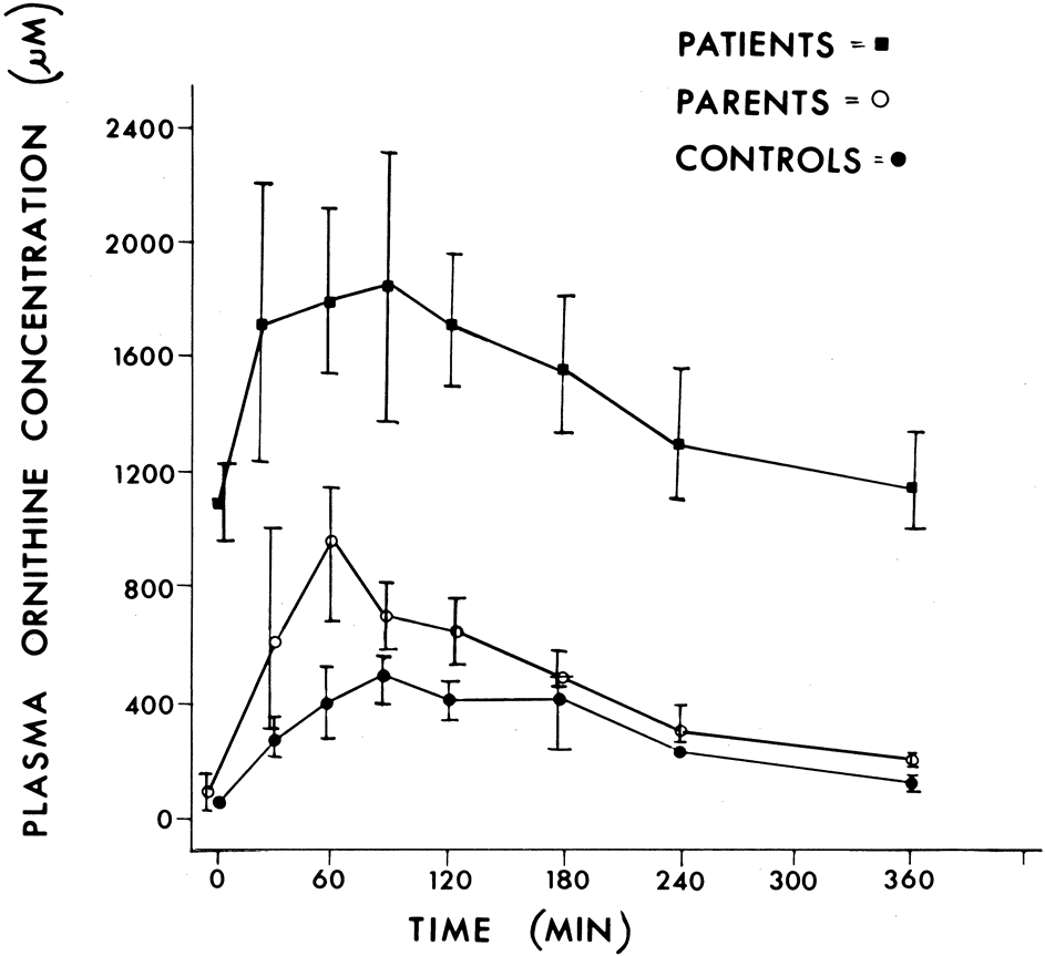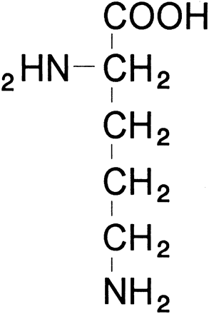 ALTERED PLASMA AMINO ACID PROFILE Ornithine is a dibasic amino acid that is not normally found in proteins (Figs. 6 and 7). However, it plays a pivotal role in the urea cycle (Fig. 8). The initial discovery by Simell and Takki9 of extreme elevations of ornithine levels in the plasma, urine, cerebrospinal fluid, and aqueous humor of patients with GA encouraged others to search for secondary alterations in amino acids. McCulloch and coworkers11 and Arshinoff and coworkers46 reported the presence of hypolysinemia, hypoglutamic acidemia, and hypoglutaminemia, which was confirmed by Valle and coworkers,88 who also found the presence of hypoammonemia. The mechanism of the hypolysinemia, hypoglutamic acidemia, hypoglutaminemia, and hypoammonemia has been proposed to be excessive excretion secondary to renal tubular readsorption competitive blockade by hyperornithinuria in the renal proximal tubular filtrate.46,88,89