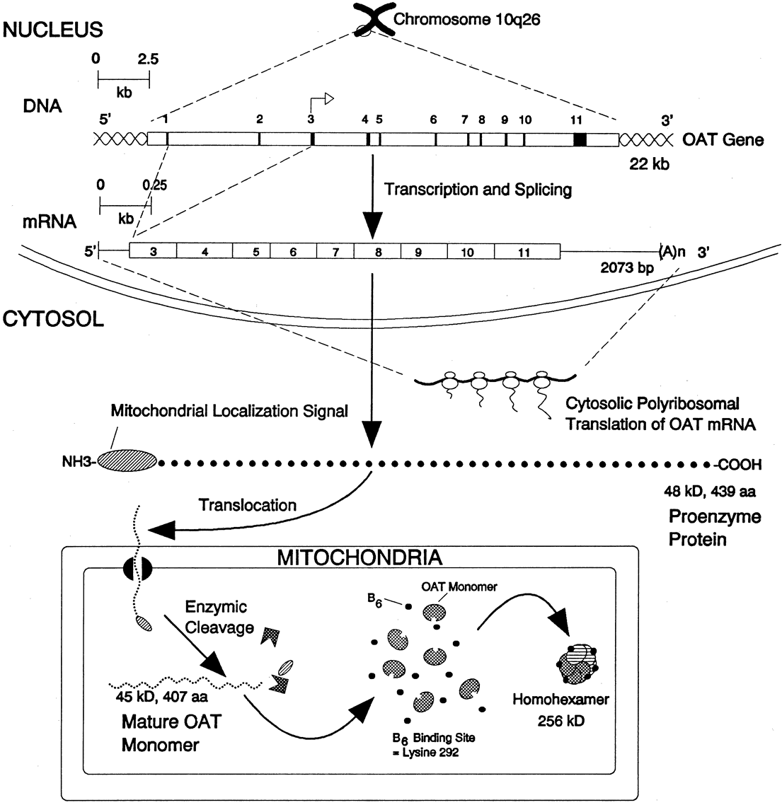 THE MOLECULAR GENETICS OF ORNITHINE AMINOTRANSFERASE Soon after the discovery of the association between hyperornithinemia and GA, OAT deficiency was hypothesized by many investigators to be the underlying enzymatic defect (see Fig. 8).9,11,42 Takki22 was the first to report negligible OAT activity in cultured fibroblasts in this disease. This finding was confirmed by many others in cultured fibroblasts, phytohemagglutinin-transformed lymphocytes, skeletal muscle, and liver.21,35,100–111 Enzymatic heterogeneity was first demonstrated by the fact that a minority of patients' fibroblasts showed marked increases in OAT activity (from negligible to about one-third normal) when large amounts of PLP (vitamin B6) were added to the assay medium.98 Wirtz and co-workers112 demonstrated the enzymatic heterogeneity between B6-responsive and -nonresponsive patients using complementation analysis on GA patients. More recently, DNA sequencing of GA patients has revealed a multitude of primary defects, due to over 60 different mutations in the OAT gene.8 In the majority of cases, the basic genetic defect resides in production of abnormal enzyme with an amino acid substitution at the DNA level.113 However, Inana and associates,114,115 Hotta and colleagues,116 and Shull and Pitot117 characterized a single patient whose heterozygous-defective OAT alleles resulted in a complete absence of OAT mRNA expression, further expanding the genetic heterogeneity observed in GA. This patient's defect, unlike all the others to date, results in a failure to produce enzyme protein. Other data published to date on the kinetics of residual enzyme activity and on immunologic quantification of enzyme protein in GA patients, heterozygotes, and normal controls, demonstrated production of normal amounts of kinetically abnormal enzyme protein.110,111,118 The human OAT gene has now been well characterized at both the DNA and mRNA levels, and extensive studies by various groups have successfully cloned the gene defect responsible for GA and localized it to chromosome 10q26.113,119,120 It is interesting to note that several nonfunctional OAT-like sequences exist on chromosome Xp11.2-p11.3 and map to the same region as two other retinal degenerative diseases: X-linked retinitis pigmentosa and Norrie's disease.121 The human OAT gene is 21 kilobases in length (genomic DNA), with 11 exons and a promoter region. The gene transcribes a 2073-base pair mRNA, which is translated into a protein precursor consisting of 439 amino acids (48, 534 daltons) (Fig. 10).119,120 The precursor is then translocated into mitochondria, where it is processed to yield a mature OAT monomer consisting of 407 amino acids (45, 136 daltons).114,123 The human holoenzyme was found to be a 256-kilodalton homohexamer with one molecule of cofactor PLP bound to each subunit.124 DNA regulatory sequences are present at the 5' end of the gene, including a 22–base pair element that resembles an estrogen-responsive element. DNA sequencing of the OAT gene from GA patients has revealed that the overwhelming majority of them express normal quantities of normal-sized OAT mRNA. Among the mutations reported are 34 missense mutations, ten nonsense mutations, ten microdeletions, one microinsertion, and three errors resulting in splicing defects, giving us an idea of the relative frequencies of different genetic defects in GA patients. The more than 60 mutations identified thus far in the OAT gene8 and the wide range of residual OAT activity in GA patients serve to emphasize the genetic and biochemical heterogeneity in this disease. It would appear that GA confers a genetic disadvantage on the patient as evidenced by the relative lack of propagation of these mutations (i.e., identical mutations recur infrequently in different family studies).8,125 Localization of the gene has confirmed the autosomal recessive inheritance pattern of GA.1,2,107