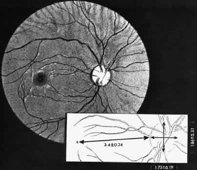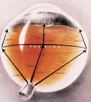 the posteriorborder of the limbus, the distance is 6.14 ± 0.85 mmsuperiorly, 6.20 ± 0.76 mm inferiorly, 5.73 ± 0.81 mmnasally, and 6.53 ± 0.75 mm temporally (Fig. 2).1,2 The retina expands from the optic disc to line the posterior pole and reach the equator, where it has an average diameter of 24.08 ± 0.94 mm in the vertical meridian and 24.03 ± 1.04 mm in the horizontal meridian. From the equator to the ora serrata, the retina diminishes in size so that at theora serrata the average retinal diameter is 20.41 ±1.09 mm vertically and 20.03 ± 1.04 mm horizontally (Fig. 3). Thus, the retina has the shape of a cup that is expanded to its greatest diameter at the equator and is considerably reduced in diameter at its serrated anterior margin.